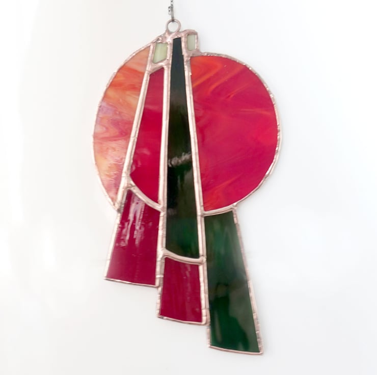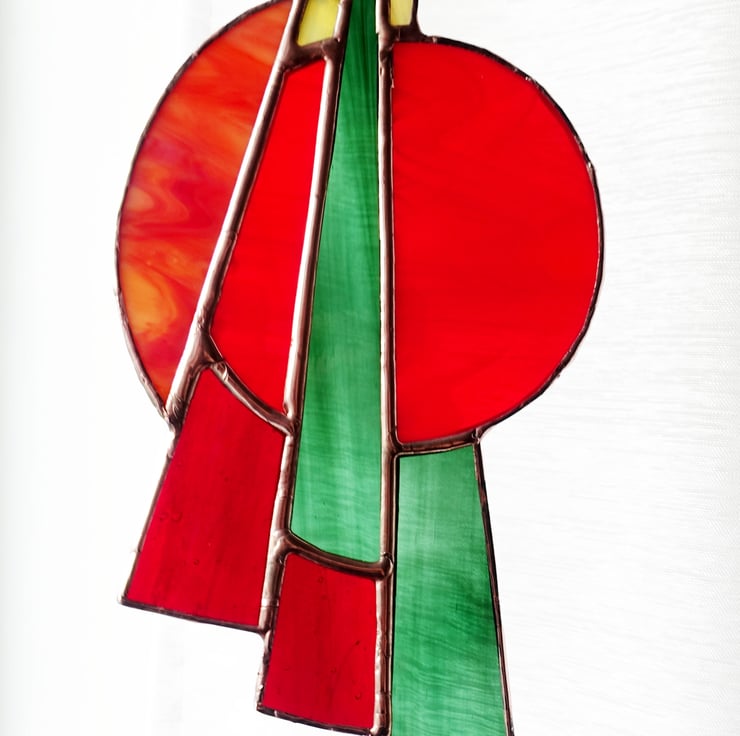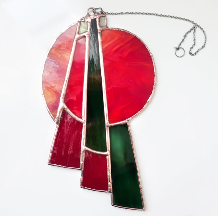 This Art Deco style suncatcher is made from a mix of ruby red, orange, moss green and yellow, using a mix of textured glass.
