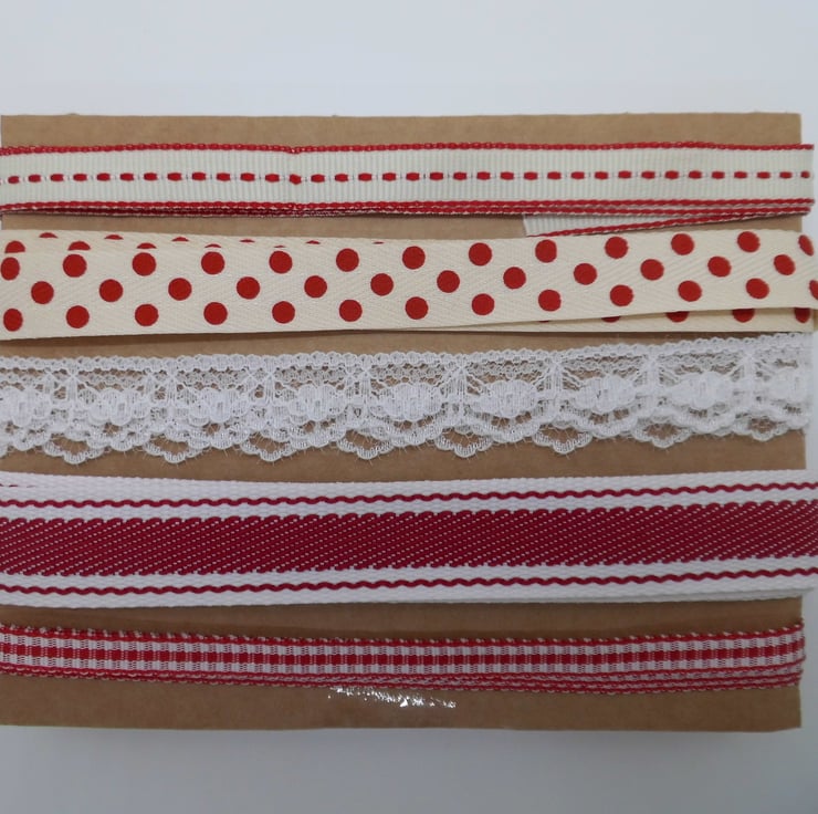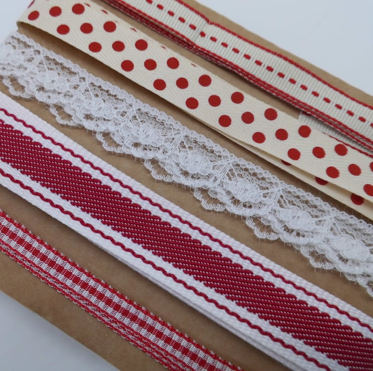 A selection of ribbon and lace suitable for various crafts such as sewing, card making, scrap booking.