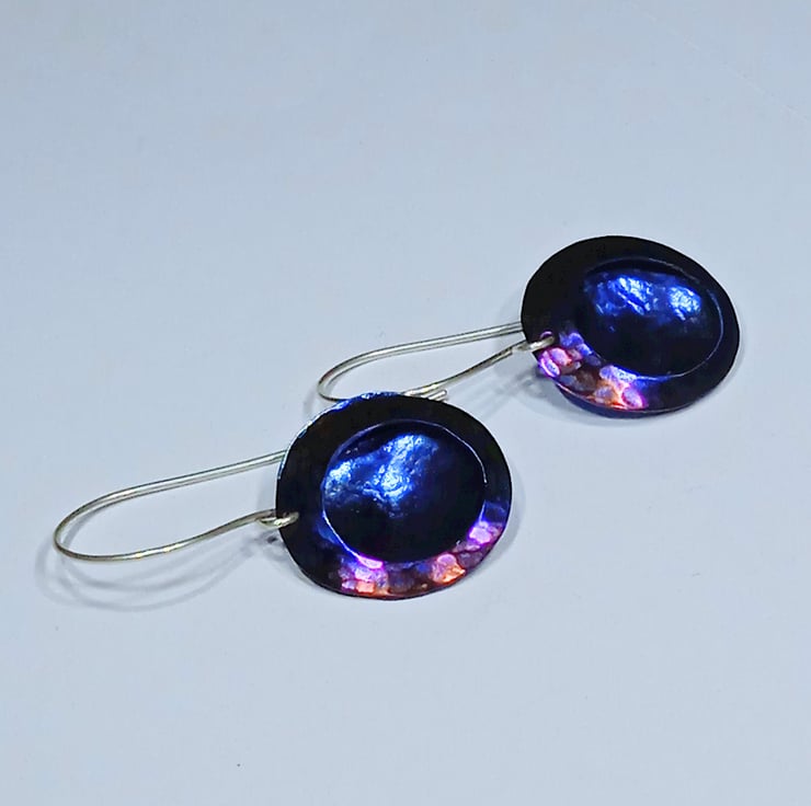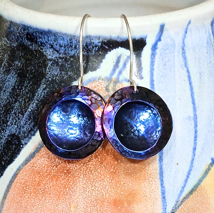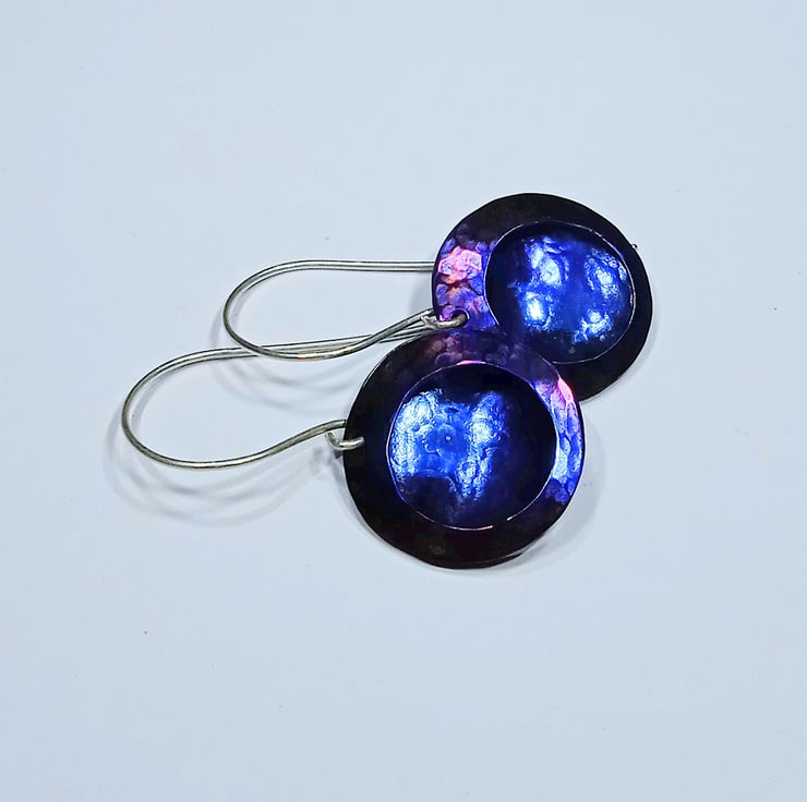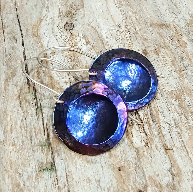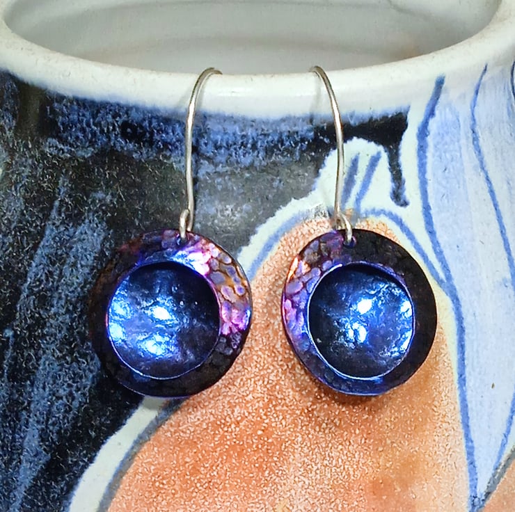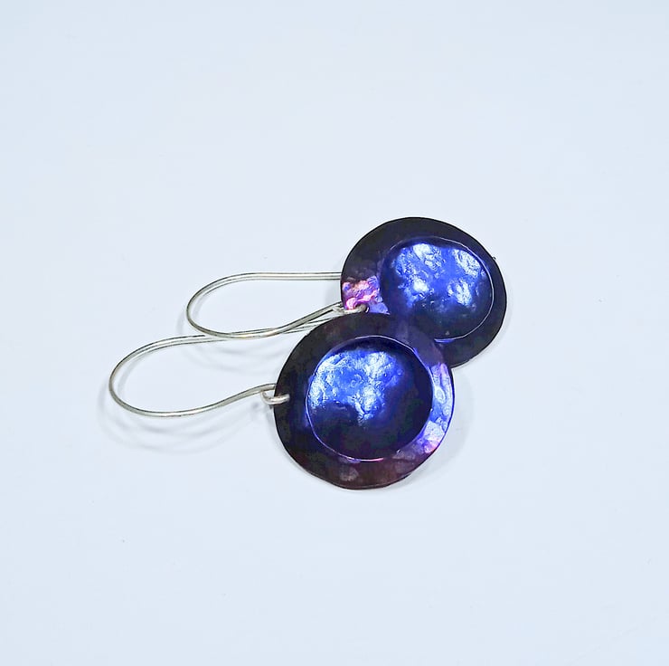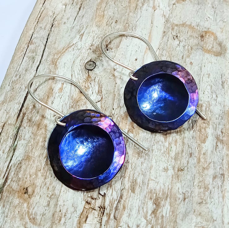 The titanium drops measure approximately 2 cm across and I have hung them from sterling silver earring wires which I have also hand made.