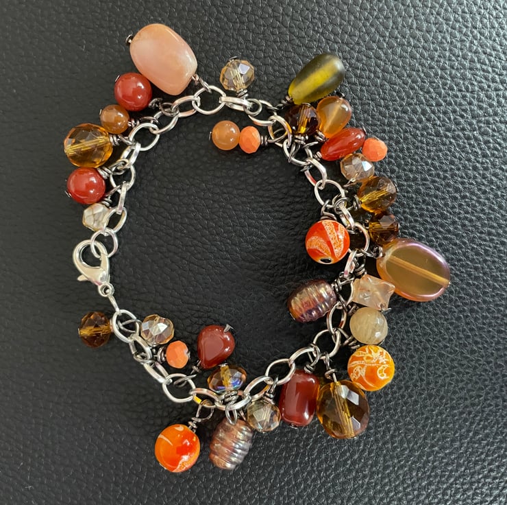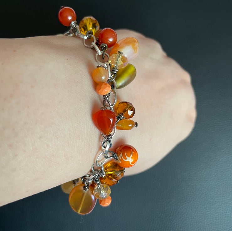 Made by hand with an assorted selection of mixed orange and yellow beads and silver tone linked, lobster clasp chain. Made by hand.