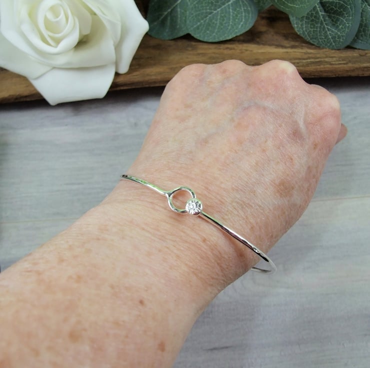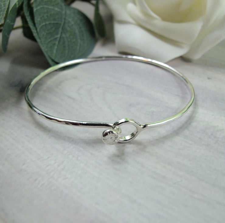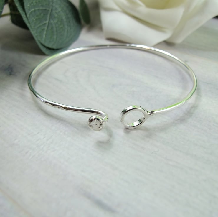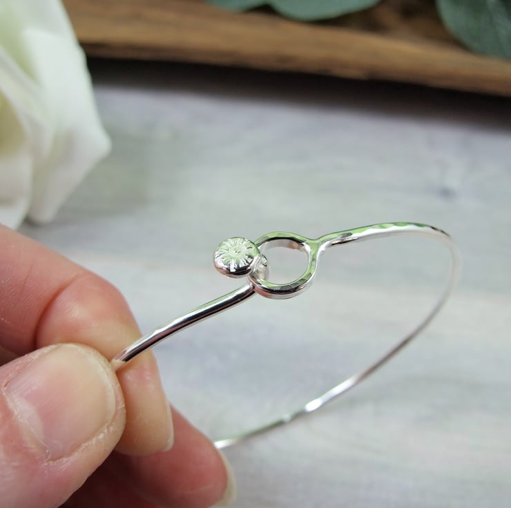 I have made the bangle from 2mm wide solid recycled sterling silver wire, at one end I have formed a circle and at the other a small hook to form the clasp, soldered to the top of the clasp is a tiny silver flower made from cast recycled silver.