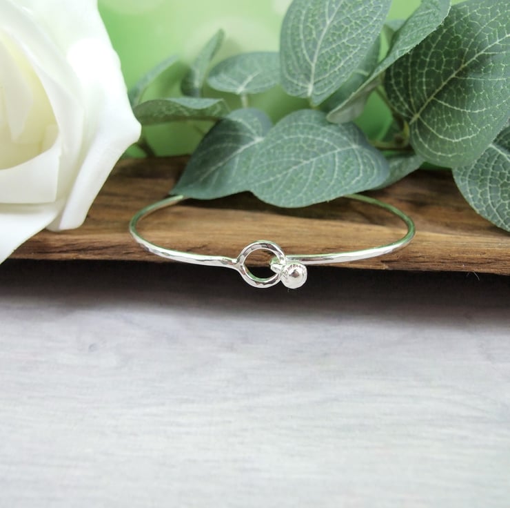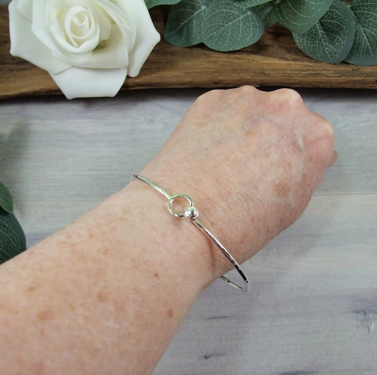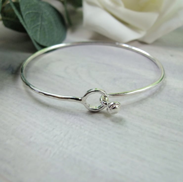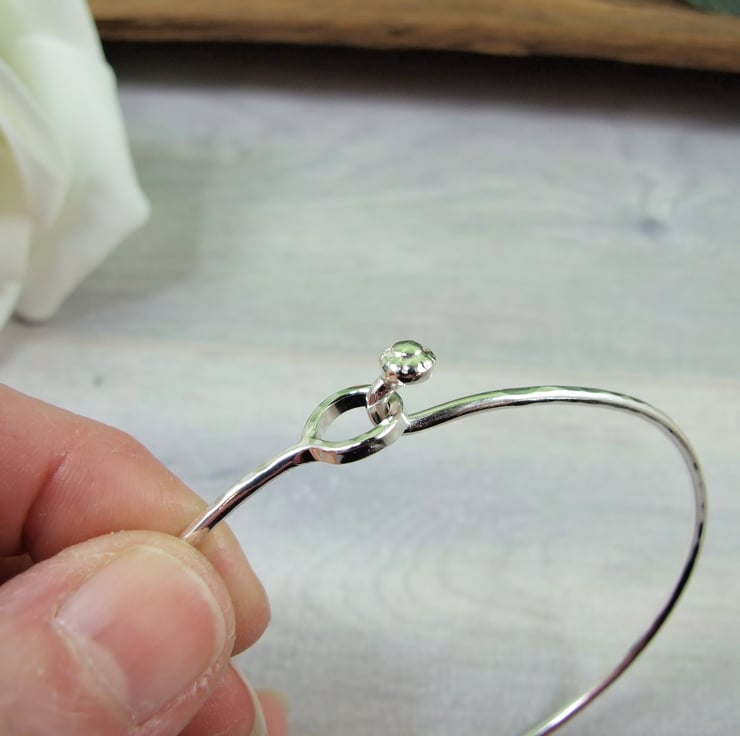 I have made the bangle from 2mm wide solid recycled sterling silver wire, at one end I have formed a circle and at the other a small hook to form the clasp, soldered to the top of the clasp is a tiny silver flower made from cast recycled silver.