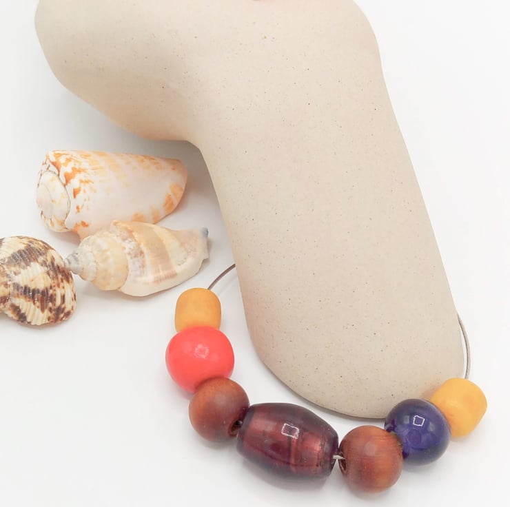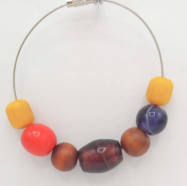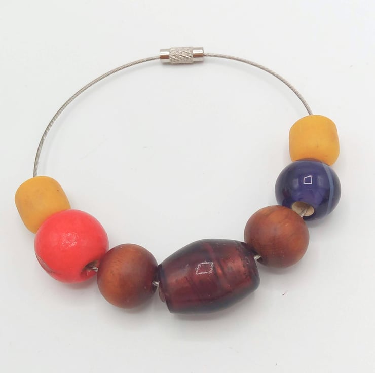 The bracelet is made using 12mm x 12mm yellow acrylic tube beads, 12mm round brown wooden beads a 15mm red wooden bead, a 15mm round purple glass bead and a 22mm x 10mm purple glass oval bead on a gray covered memory Wire Bracelet. Bracelet is 19.5cm in circumference and has a silver plated screw clasp. It will fit any normal sized wrist and it could also be used as an anklet.