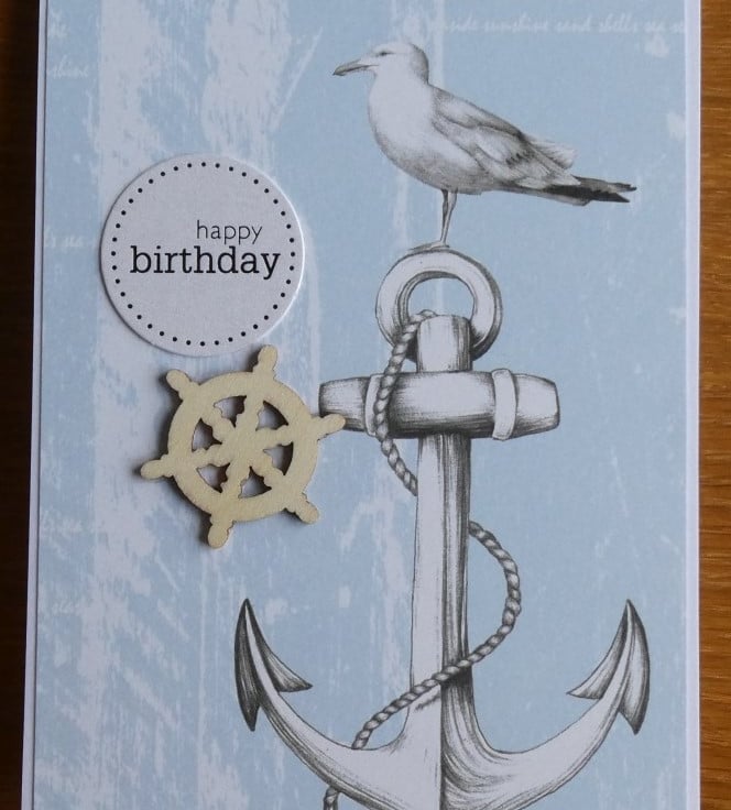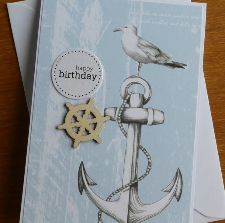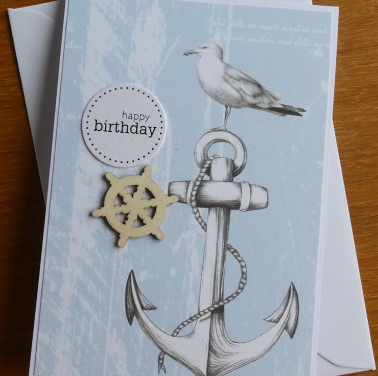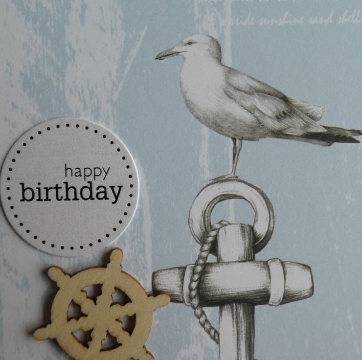 This birthday card has a pale blue & white paper background with a design of a gull sitting on top of an anchor in shades of black and grey.