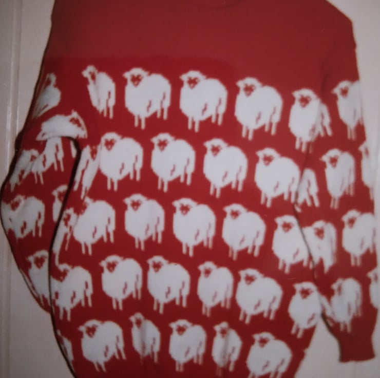 Sheep jumper in an all over design. Made to measure in 100% merino blend machine washable wool. This one is in grey or red but you can choose your own colours.