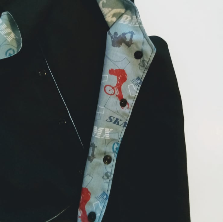 It has a black polycotton lining which allows it to be reversible for a plain black look and it is fastened with plastic poppers.