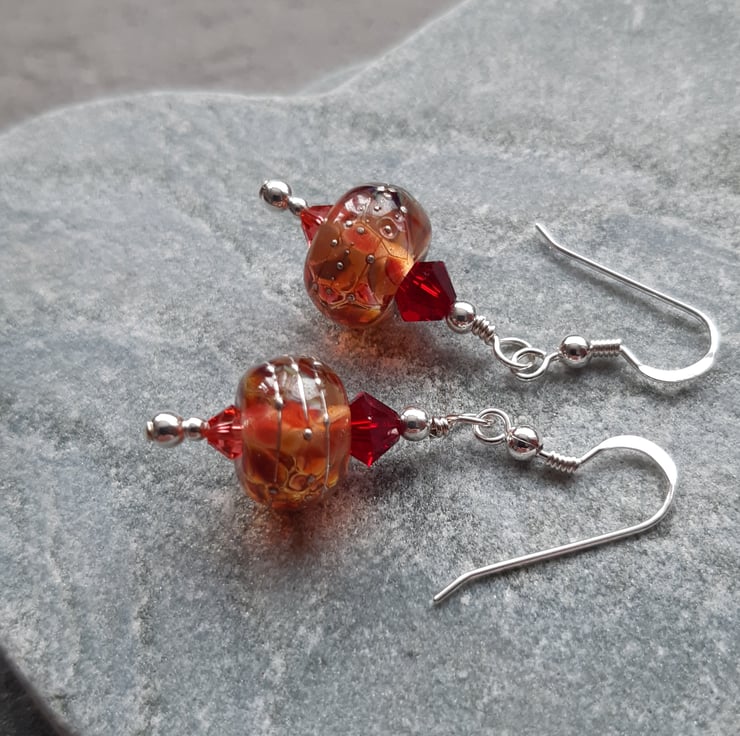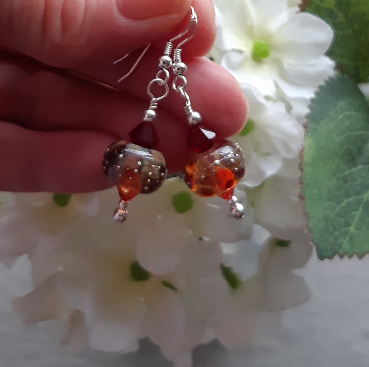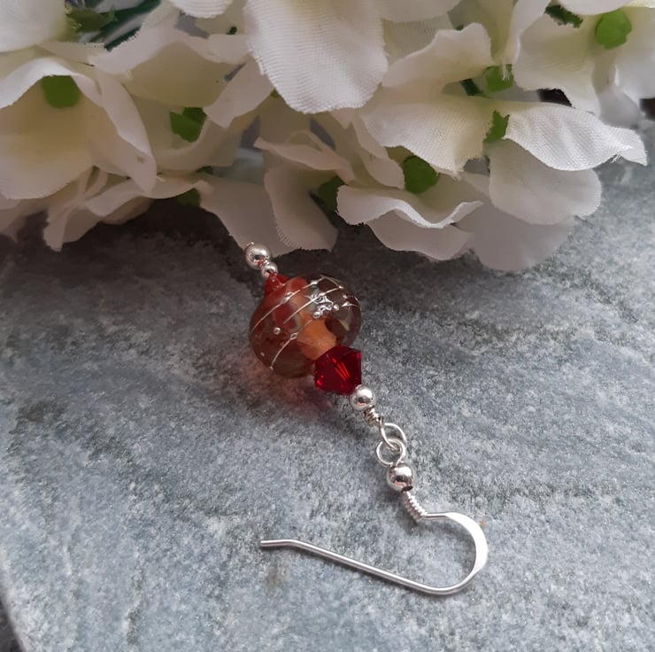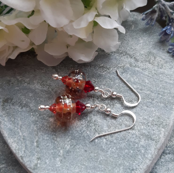 Sterling silver earrings with lovely handmade lampwork glass beads made in the UK which are tones of red and toffee in colour with small and larger red Swarovski® crystals.