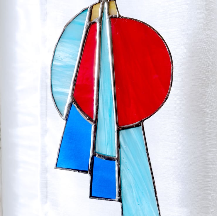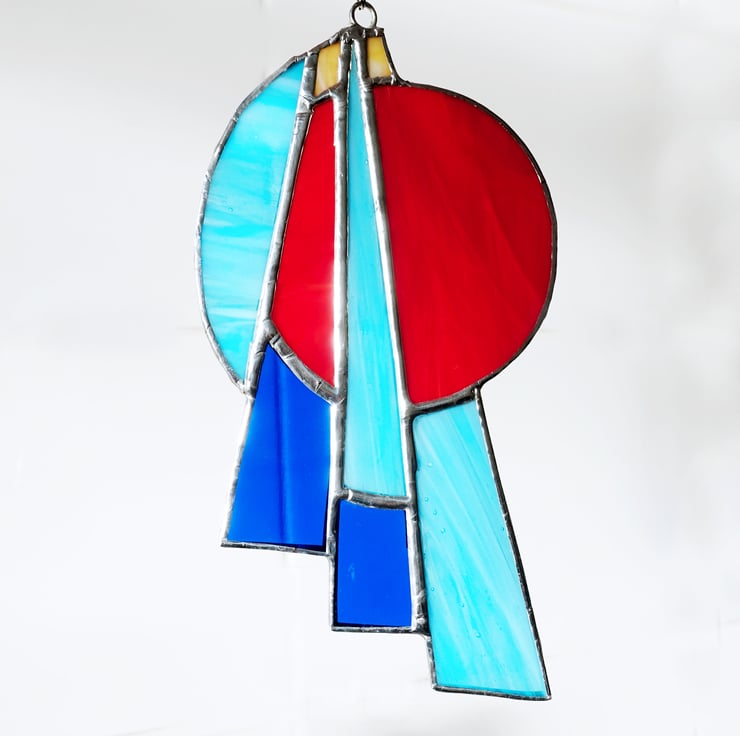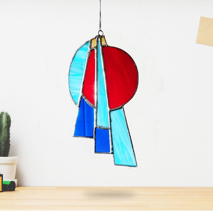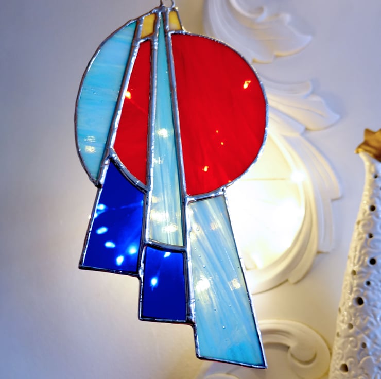 Suncatcher Window Ornament made in an Art Deco style using a mix of blues and reds in stained glass. Hangs from a slim metal chain.