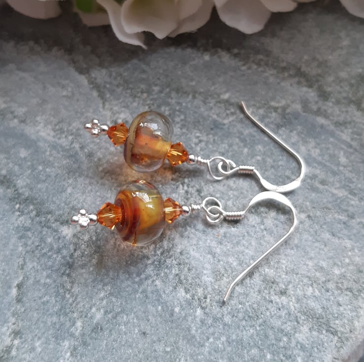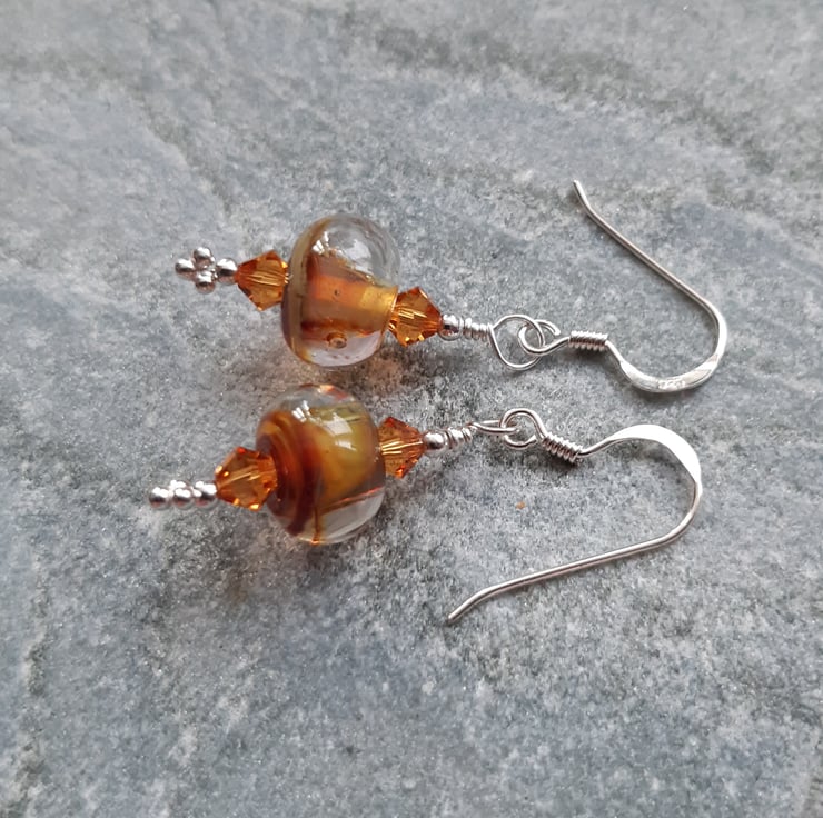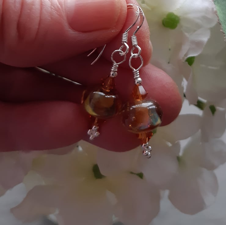 Sterling silver earrings with lovely handmade lampwork glass beads made in the UK which are golden brown tones, and golden tone swarovski® crystals.