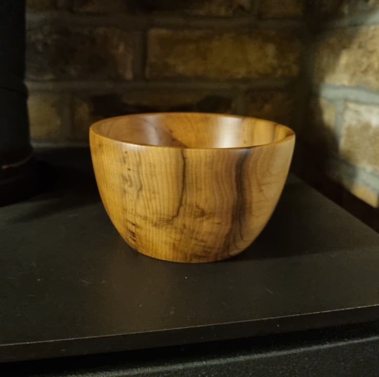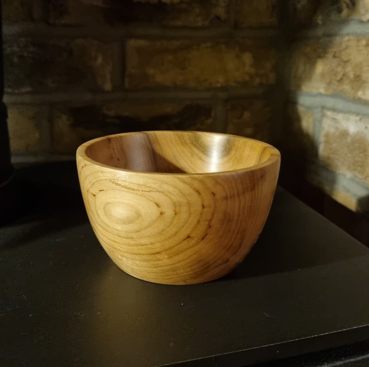 The bowl is approximately 11cm in diameter and 6.5cm tall. I've finished this bowl in a clear oil which gives a warm sheen.