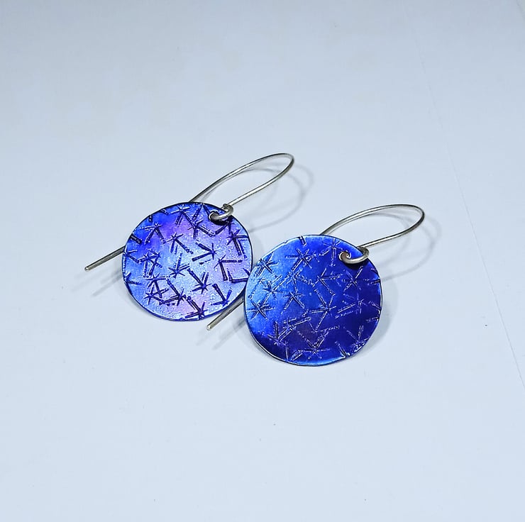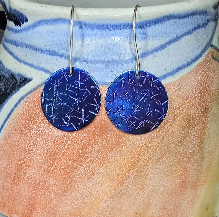 The titanium discs measure approximately 2 cm across and are hung from sterling silver earring wires I have also hand made.
