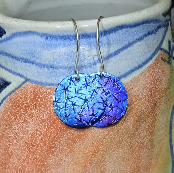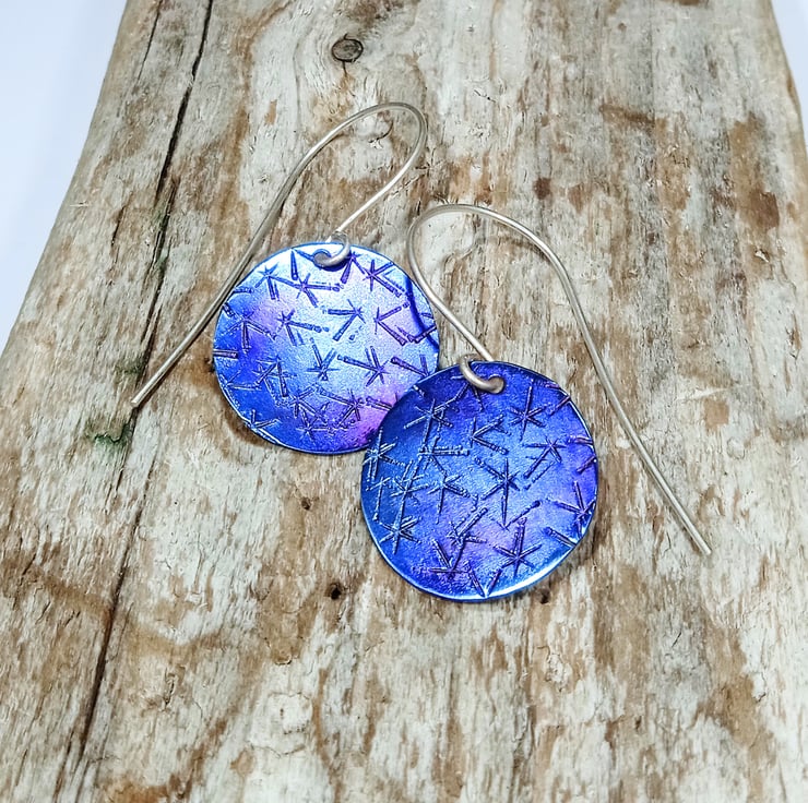 I have hand sawed the shapes from titanium sheet and have hand hammered a random star and partial star punch design to create a textured finish before colouring.