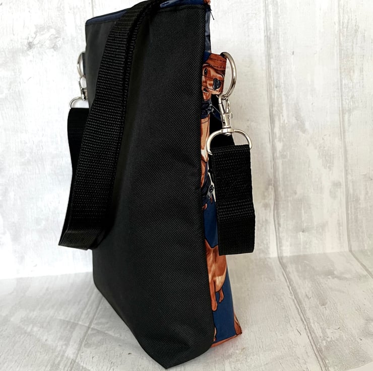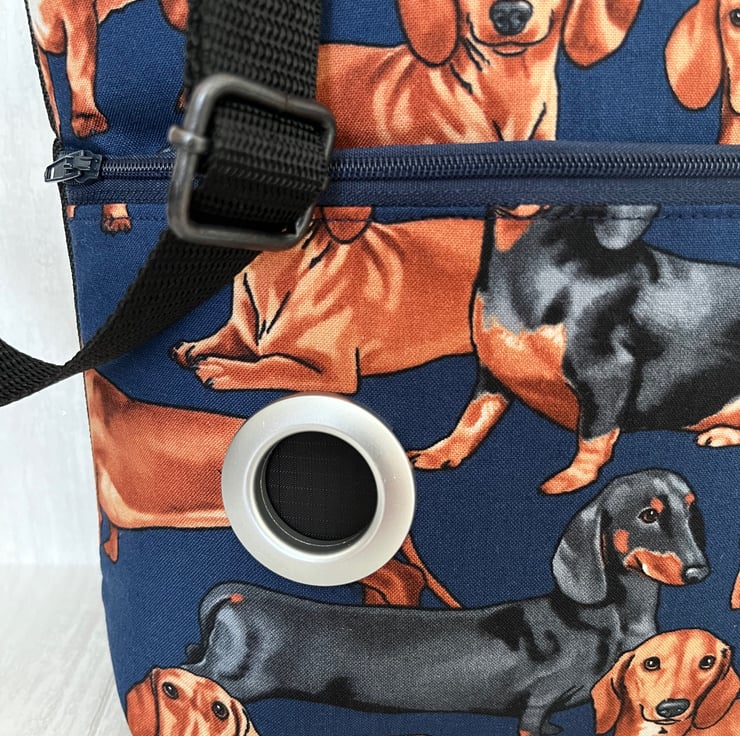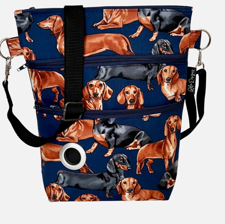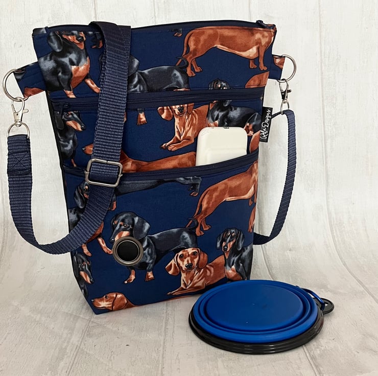 This gorgeous dachshund cotton print cross body dog walking bag has a plain black waterproof nylon canvas back and is lined with a black waterproof nylon lining. This handy bag will hold all your essentials for walking your dog.