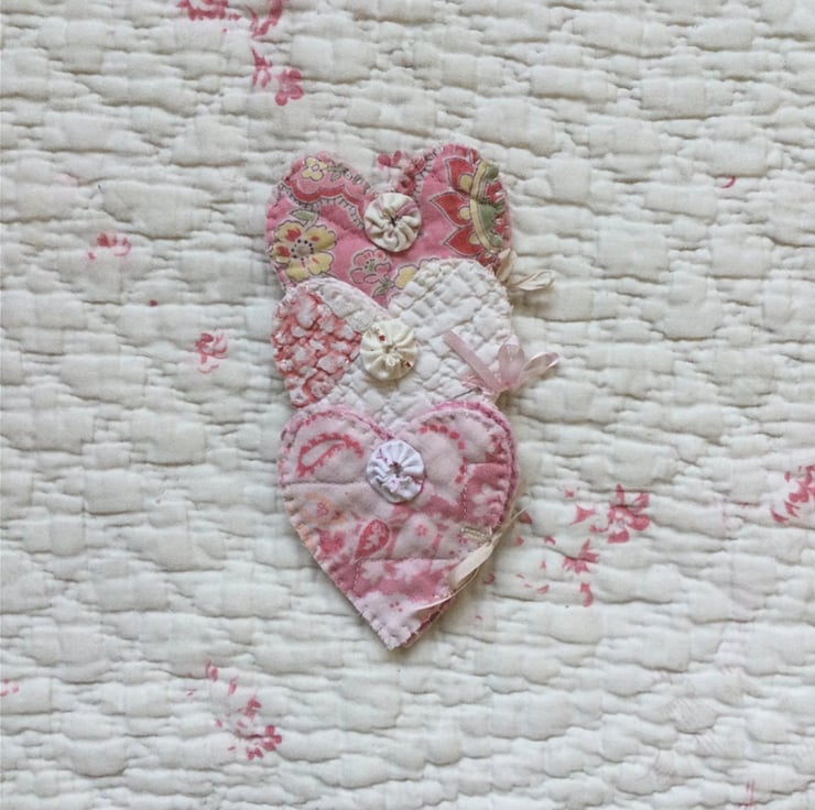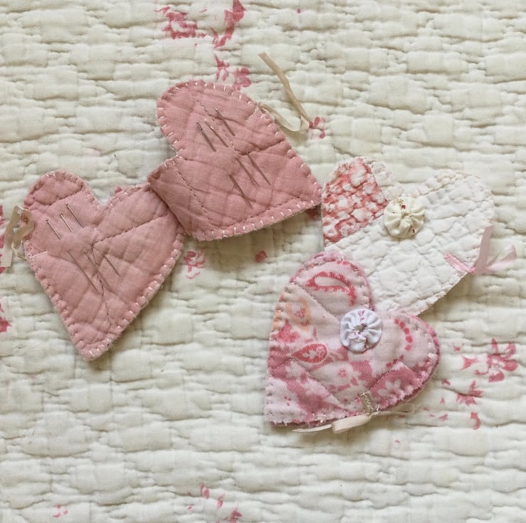 Each case is made from two vintage quilt hearts, joined together in one corner. Each heart is edged with hand embroidered blanket stitch.