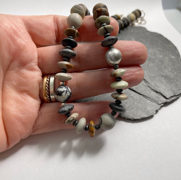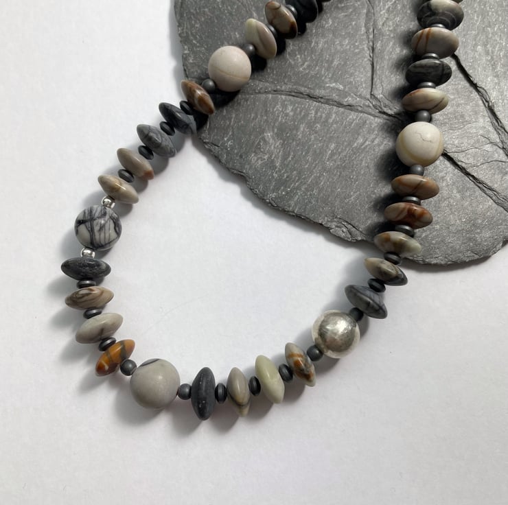 Matte Picasso Jasper and hematite necklace with silver clasp and beads.