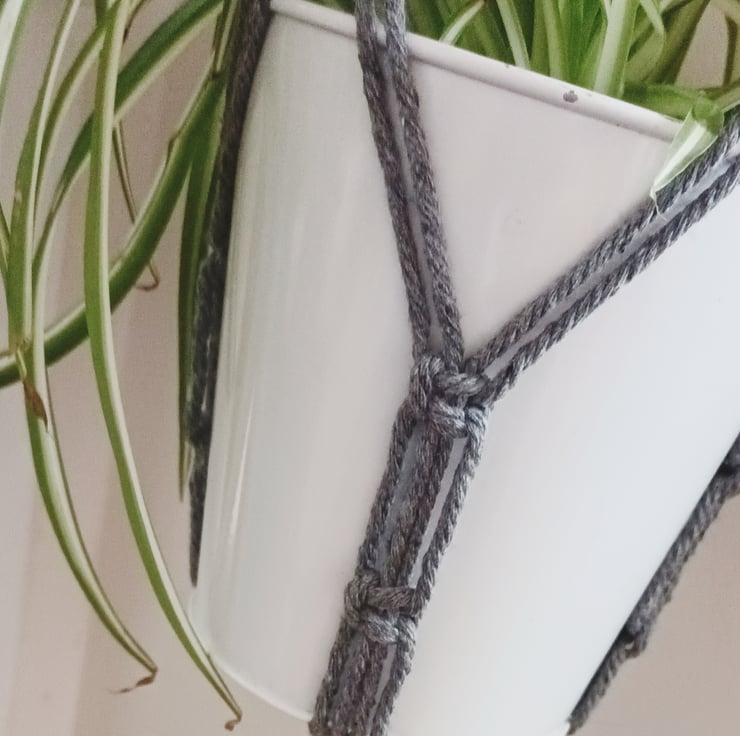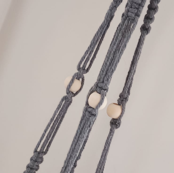 Macramé plant pot holder in a soft grey cotton twine, with a wooden ring for hanging and wooden beads