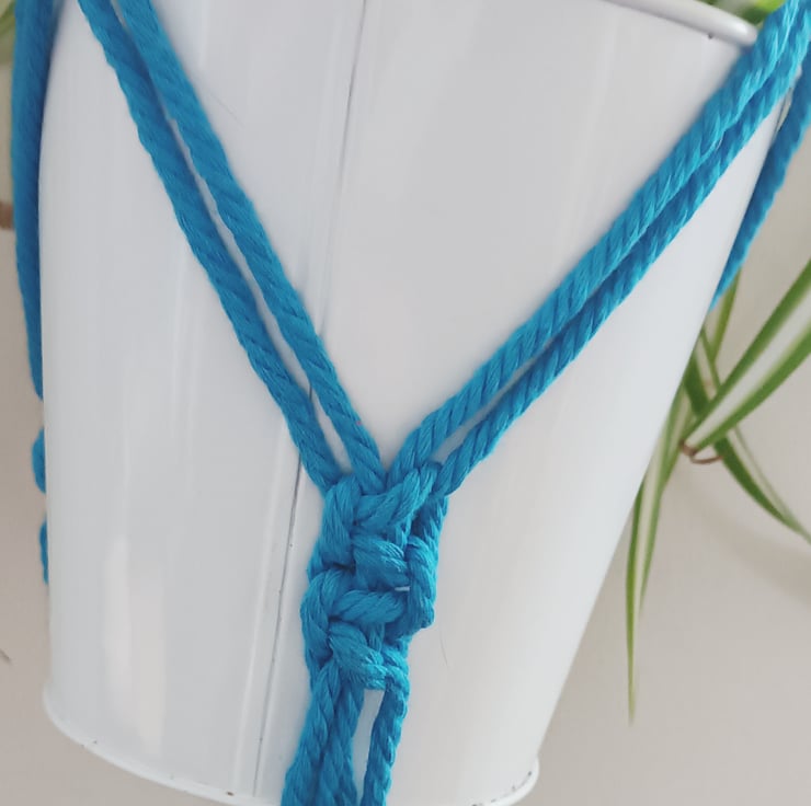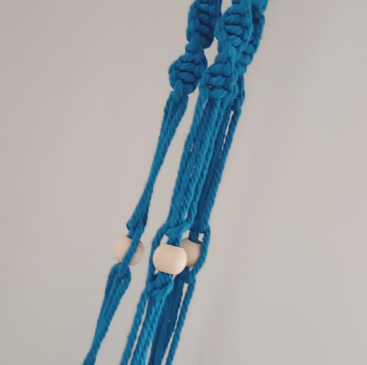 Macramé plant hanger. In blue cotton cord with wooden ring and wooden beads. Ideal gift for plant lovers