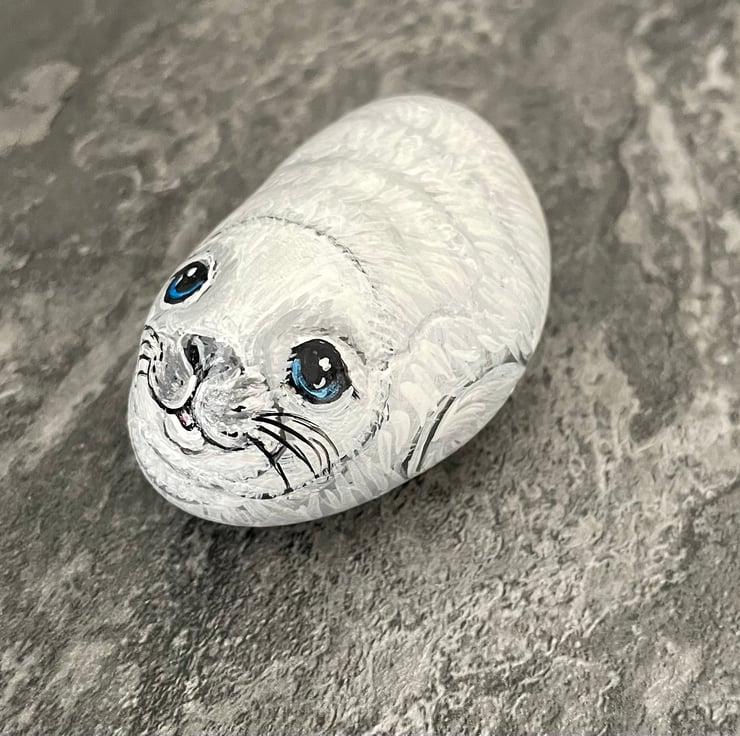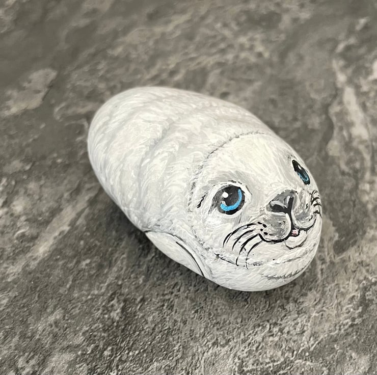This seal has been painted onto a smooth stone and glazed for a glossy protective finish