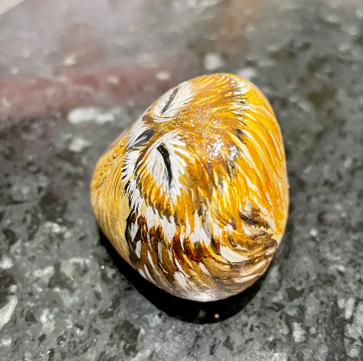 This owl had been painted on a smooth stone and glazed for a glossy protective finish