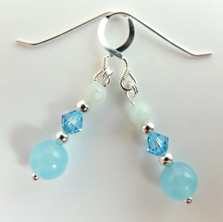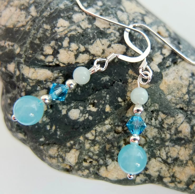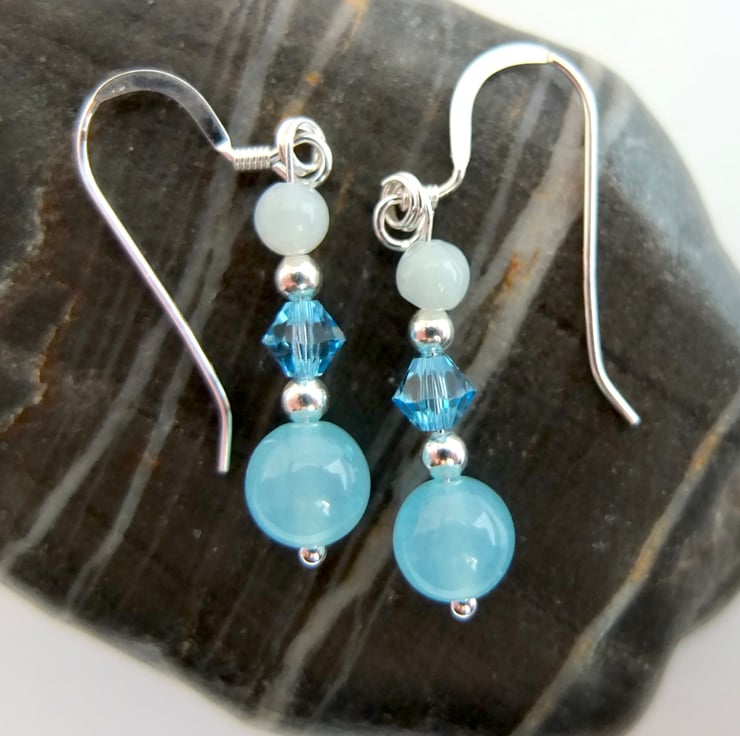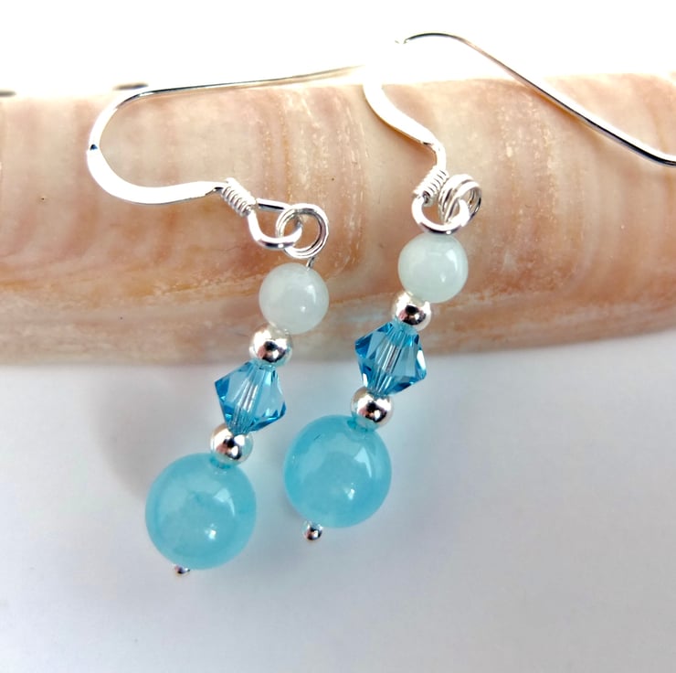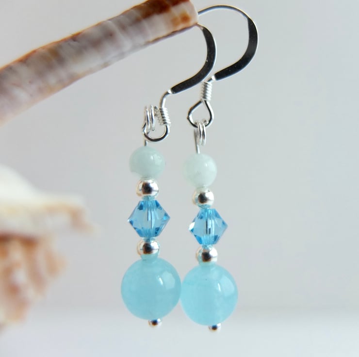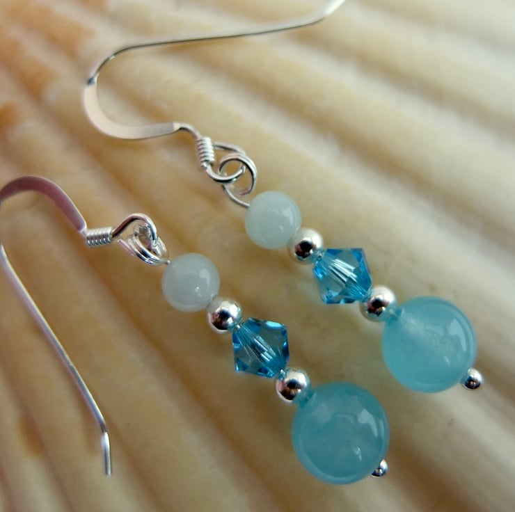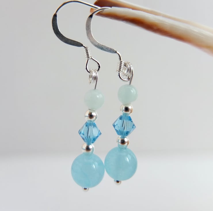 A 6mm aquamarine jade bead, Swarovski "aquamarine" crystal and 3.5mm aquamarine bead separated by tiny sterling silver spacer beads and hung from sterling silver ear-wires.