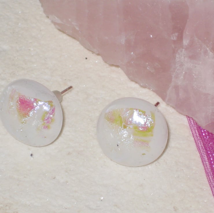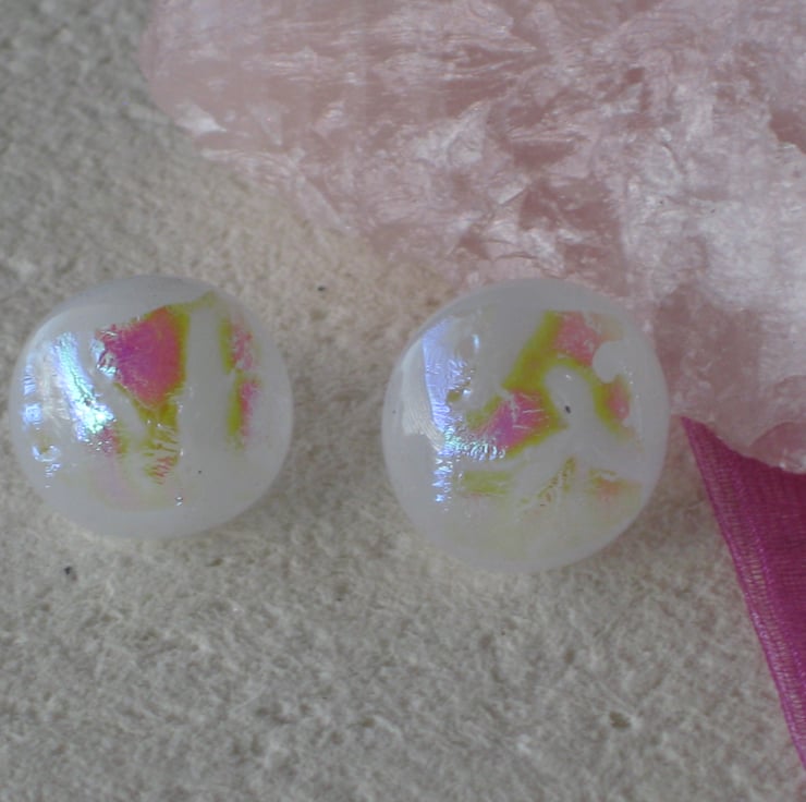 A pair of white/pink rippled 12mm round stud earrings. Handmade from quality dichroic and Bullseye glass. Created by kiln fusion. Sterling silver ear posts with soft hypoallergenic safety stoppers.