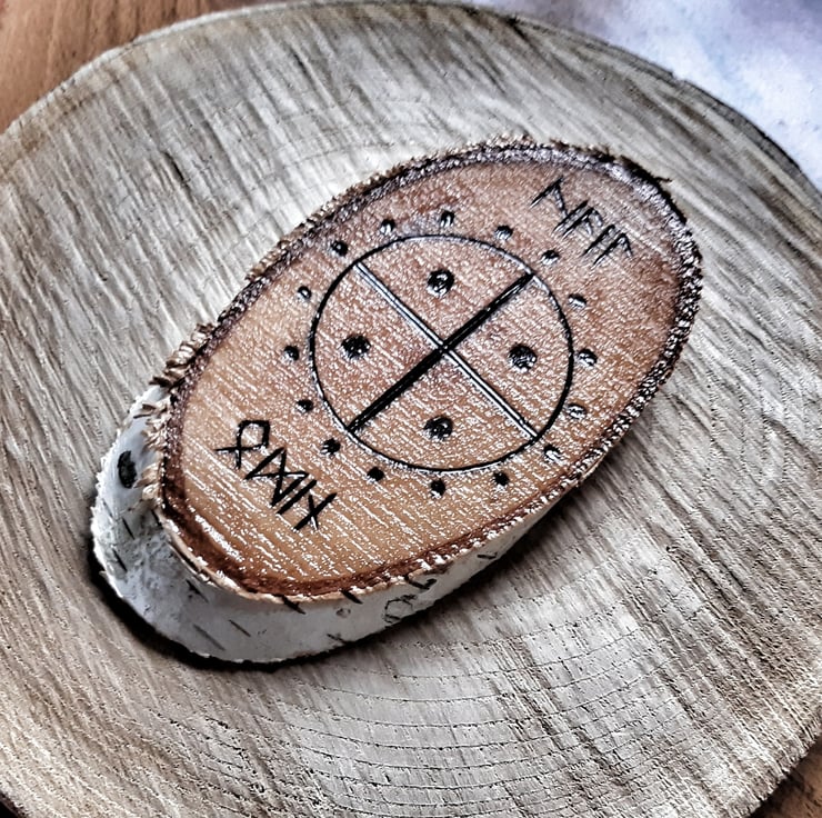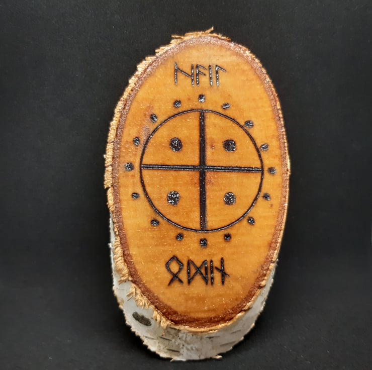 Hand made plaque with Elder Futhark Runic inscription which reads "Hail Odin", and featuring a solar cross, or Odins cross, symbol. Designed and burned by hand, with a coat of gloss to protect it.