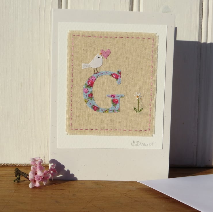A hand-stitched card with the letter 'G' cut from pretty floral fabric stitched into place with tiny stitches. I have added a miniature applique dove with heart in her beak, and then embroidered a tiny daisy flower to complete the design.