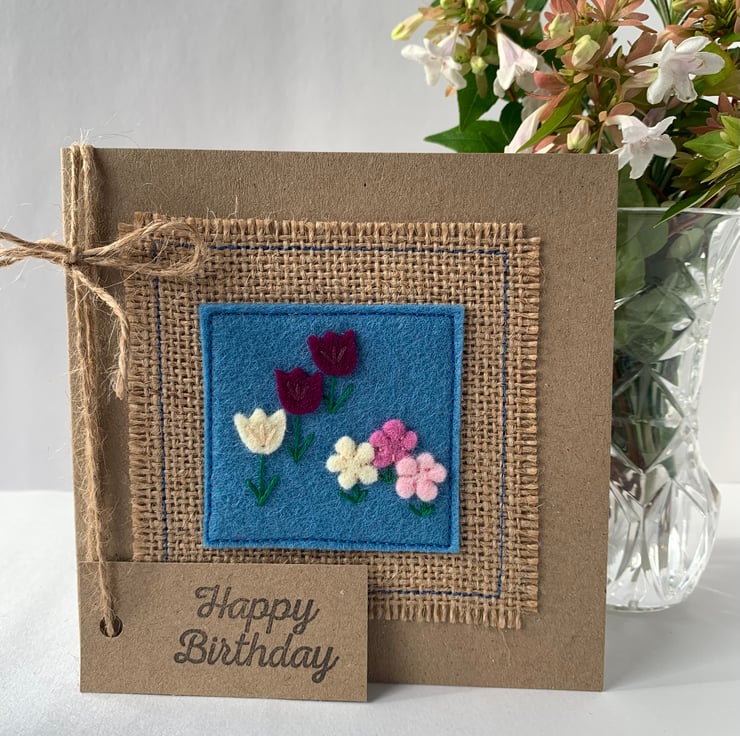 This handmade Birthday Card is decorated with flowers in shades of pink, deep red and cream on a blue background. The decoration is hand cut from 100% wool felt and sewn by hand and machine onto a hessian background.