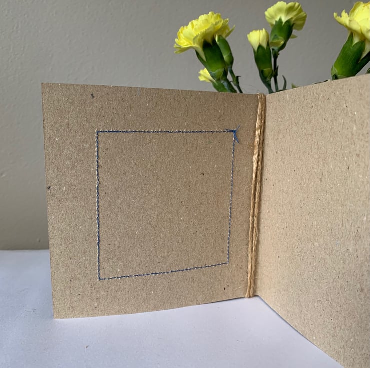 The hessian is machine stitched, using a contrasting thread, onto a plain brown recycled card. This stitching is visible on the inside of the card.