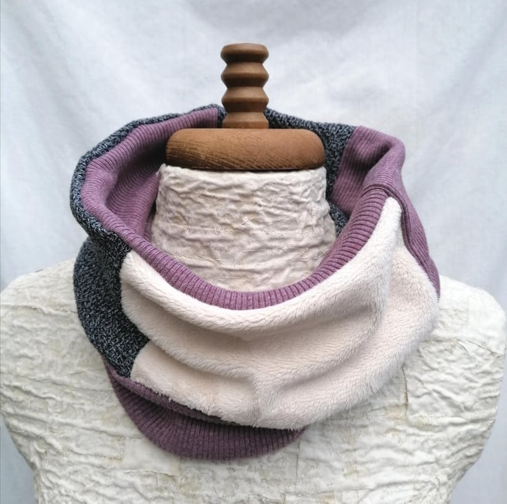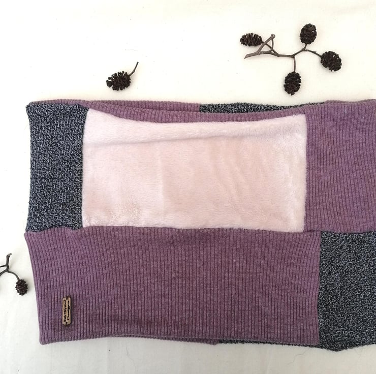 The neck warmer is a patchwork of pieces cut from a heather ribbed sweater and a grey sweater with the addition of some soft and furry remnant fleece fabric. Sewn together to create a colourful patchwork design.