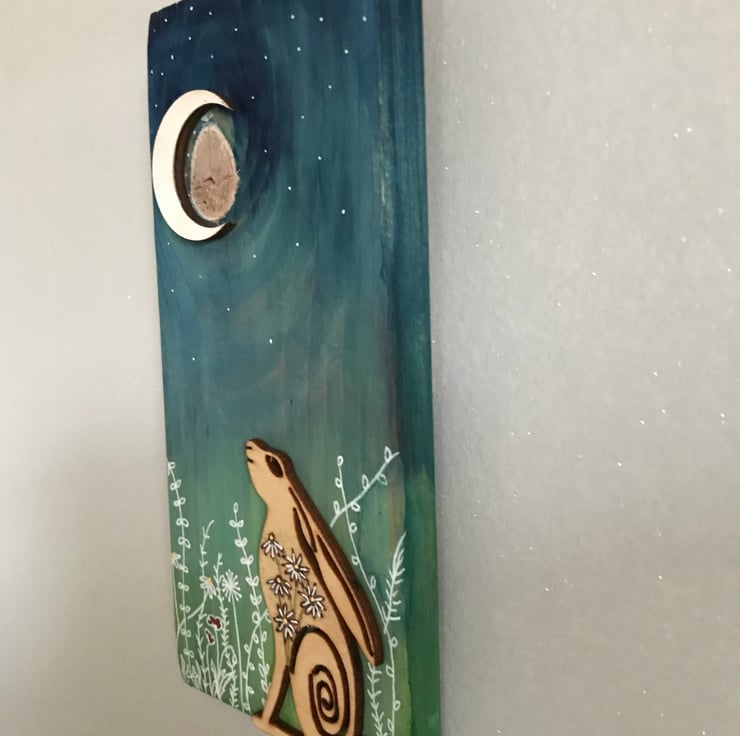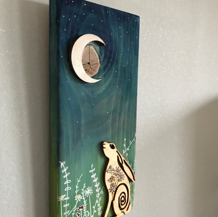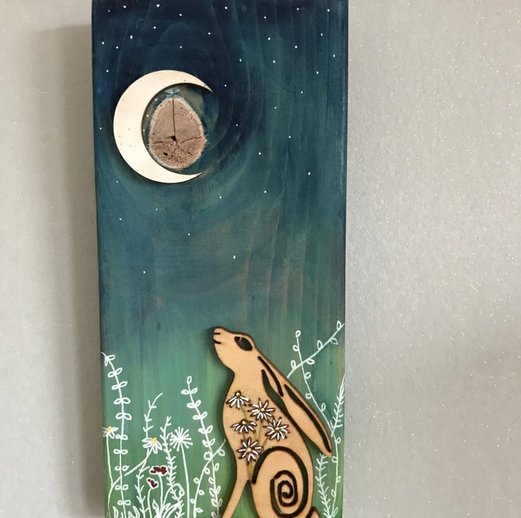 The wood is up cycled and painted in watercolour, with painted flowers, wood crescent moon and wooden hare are attached to the up-cycled wood.