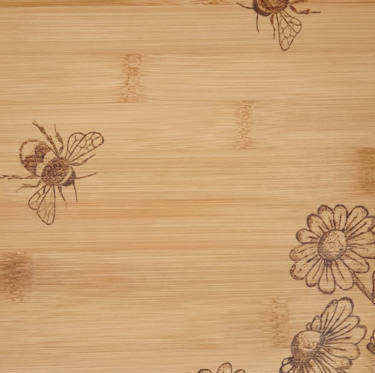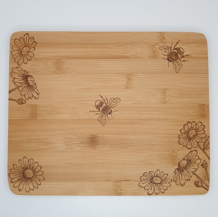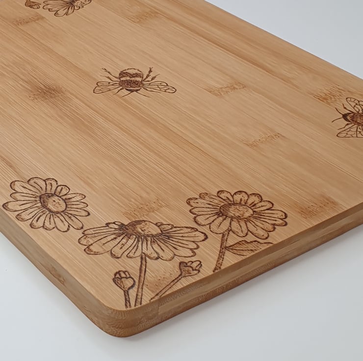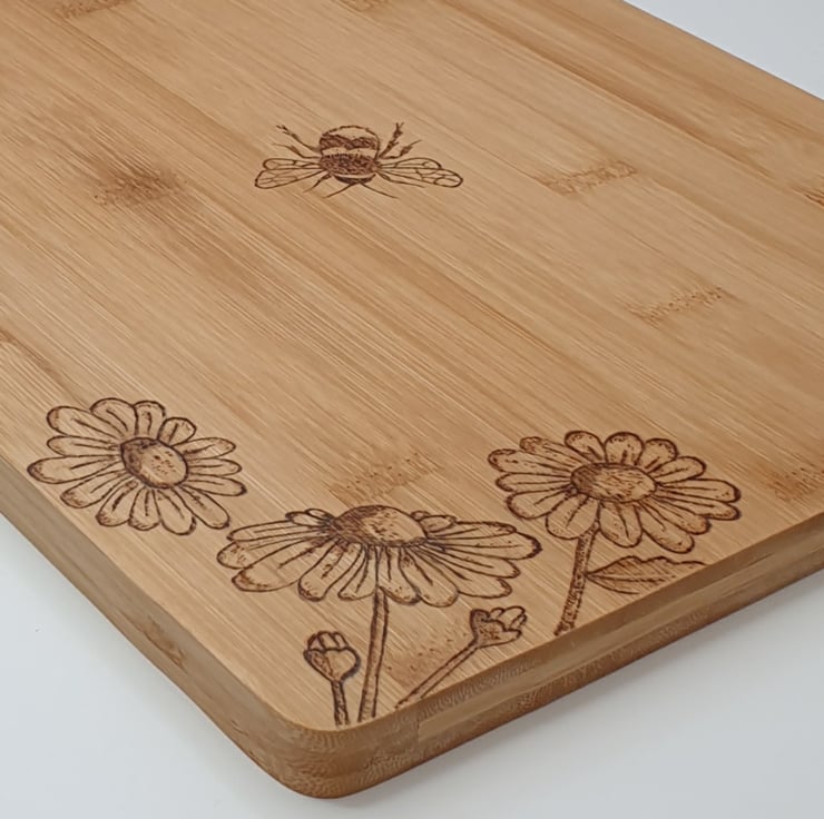 Rectangular bamboo chopping board which has been lovingly handburnt using pyrography with a bees and daisies design . The board has then been finished with food grade wood oil. The board has not been decorated on the reverse so can be turned over when using to preserve the design.