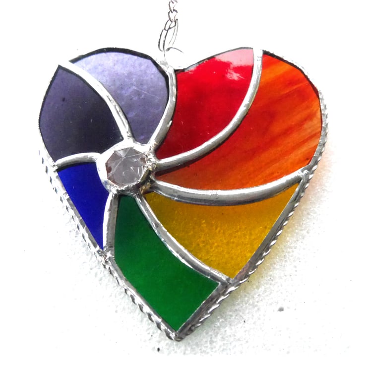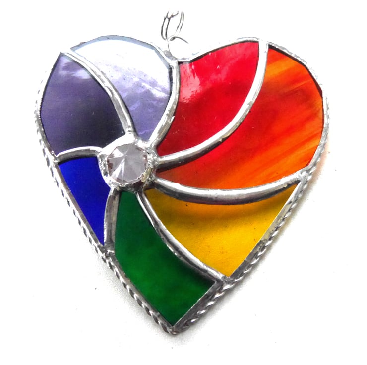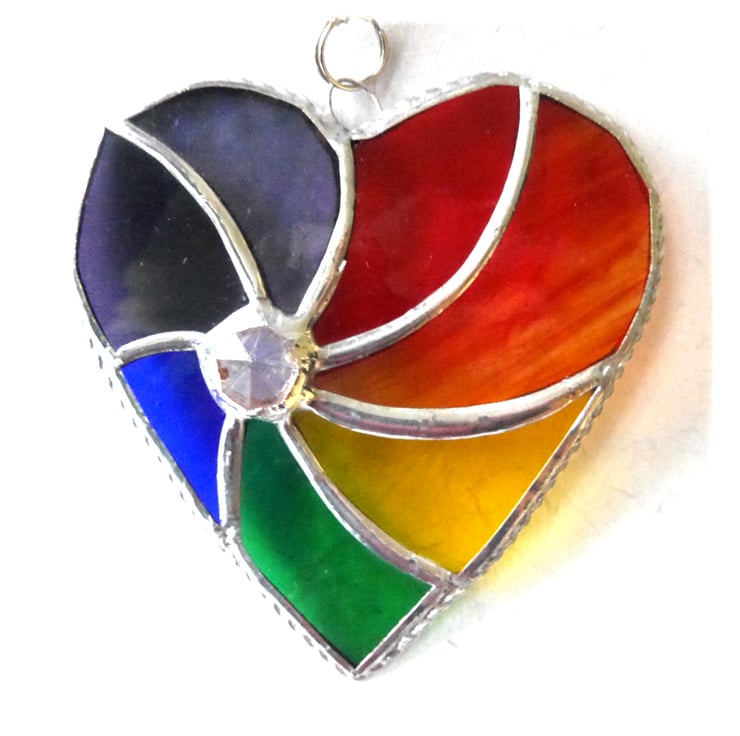 I've made the heart from 7 types and colours of glass, all the colours of the rainbow and I've set them in a swirl round a sparkling crystal.