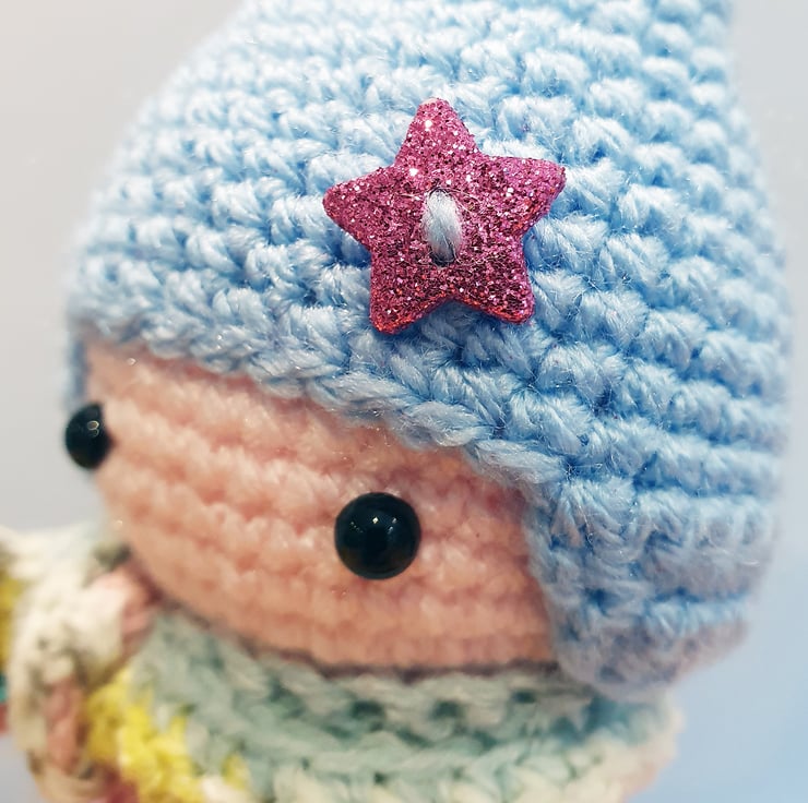 She has a stripy jumper, tweedy scarf (detachable) and is finished with a glittery star button on her hat.