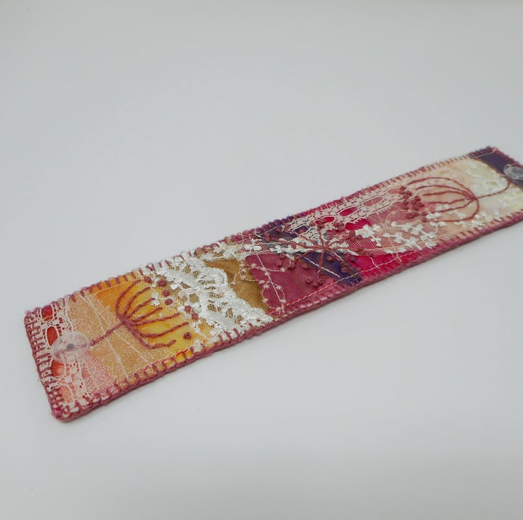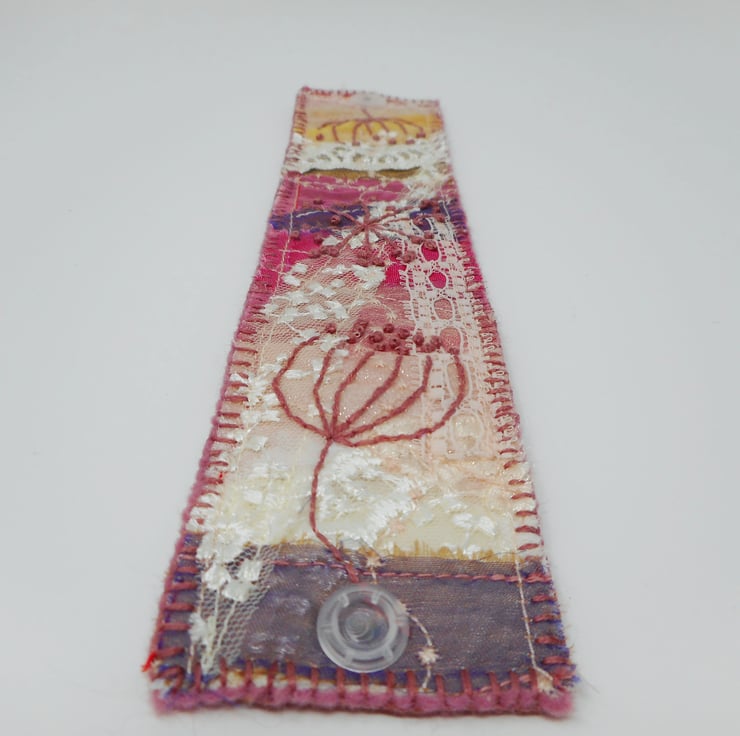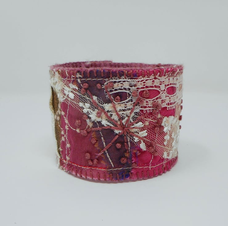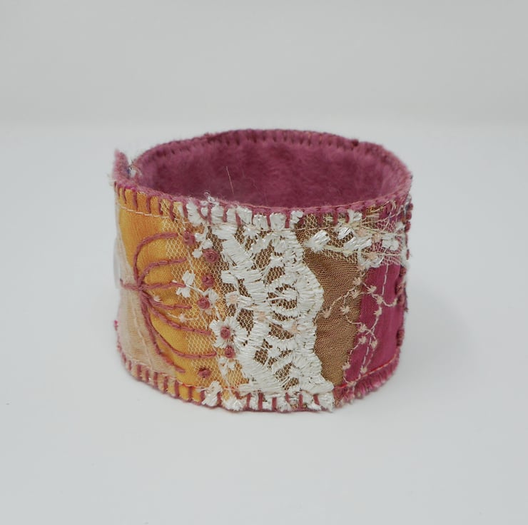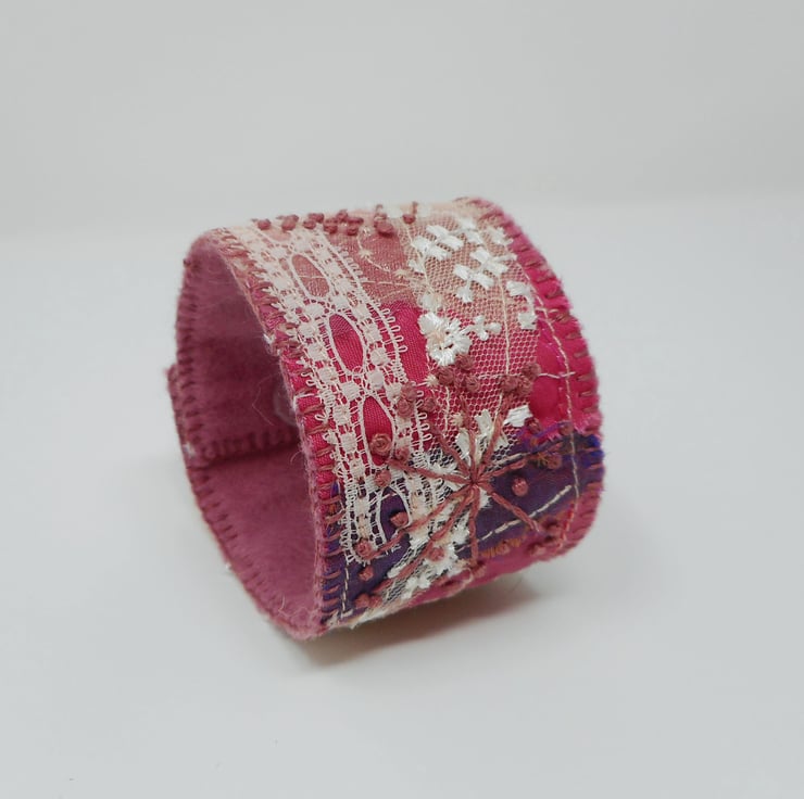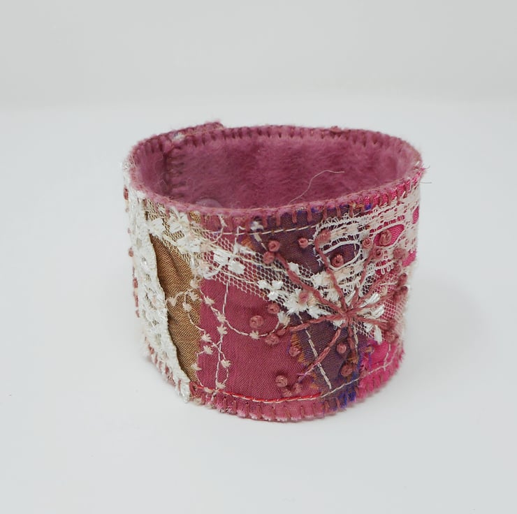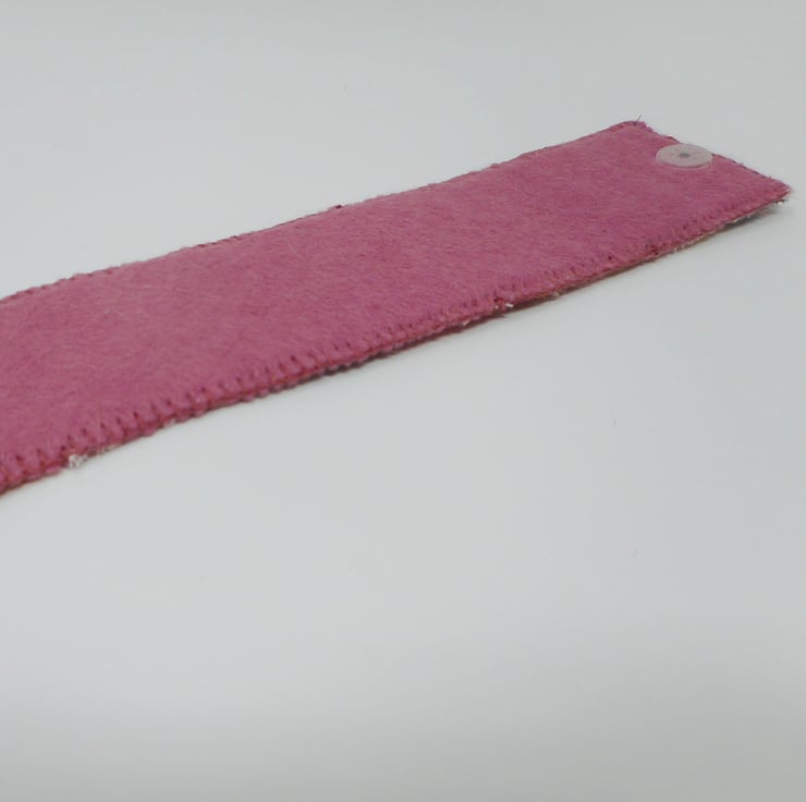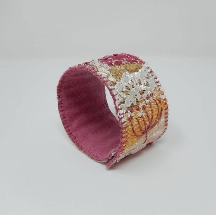 Backed with a dusky pink wool felt, this cuff fastens with a clear popper stud to an internal circumference of approximately 19.5cm. The cuff itself is approximately 5cm wide but due to its handmade nature, this varies slightly.