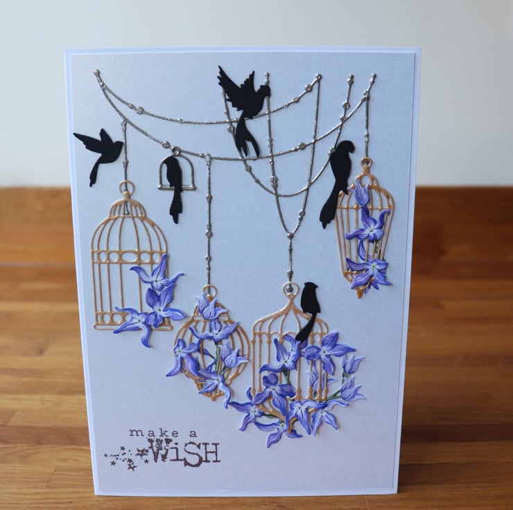 The base card is white with a matt and layer light grey pearlescent finish, the chain and bird cages I have heat embossed with silver and gold embossing powder, and then filled the cages with flowers, I then added the bird silhouettes.