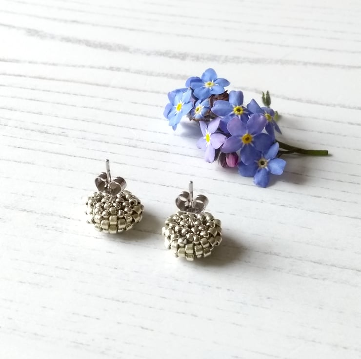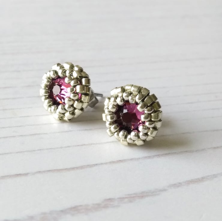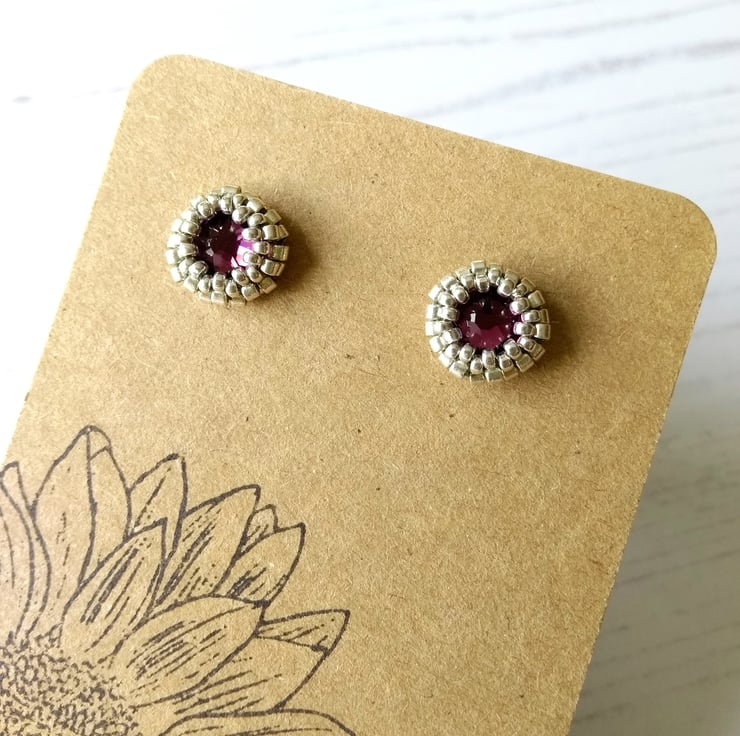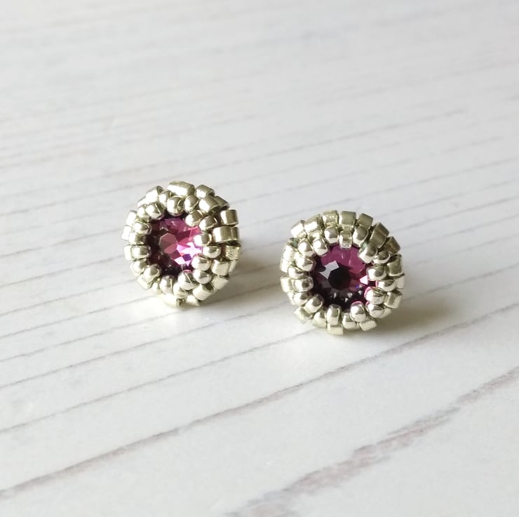Hand-beaded stud earrings featuring a purple crystal chaton surrounded by silver-coloured seed beads. These earrings are very sparkly and the colour varies depending on which type of light they catch!