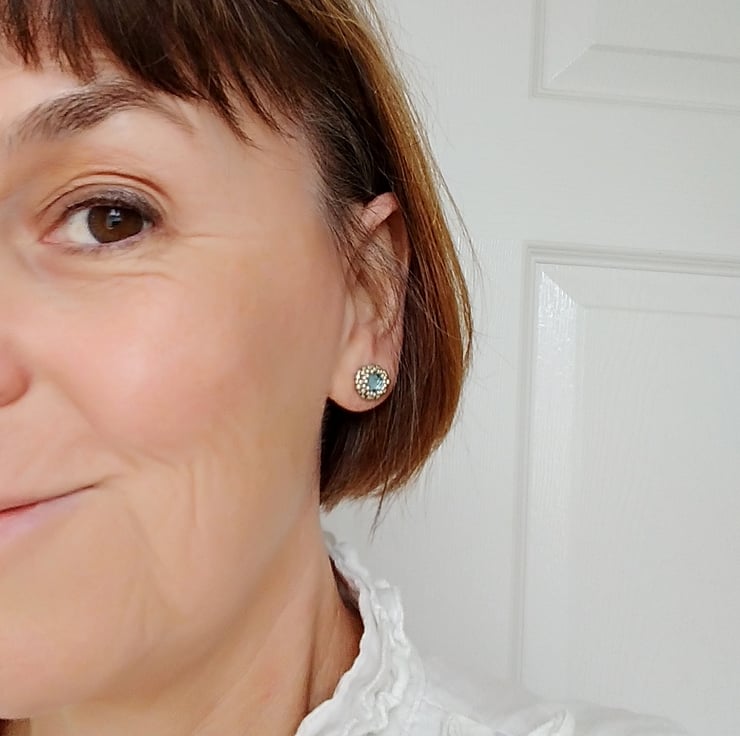 The surgical stainless steel studs (with butterfly back) have been cleverly incased within the earring (see photo), making them comfortable to wear so they fit nice and closely to the ear. The earrings measure approximately 10 mm in diameter. I am wearing my own pair of these earrings (in aquamarine) in the final photo.