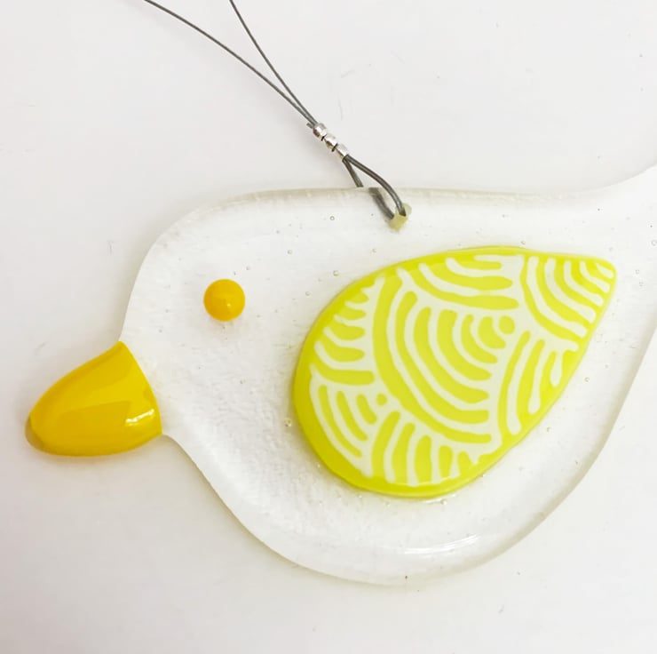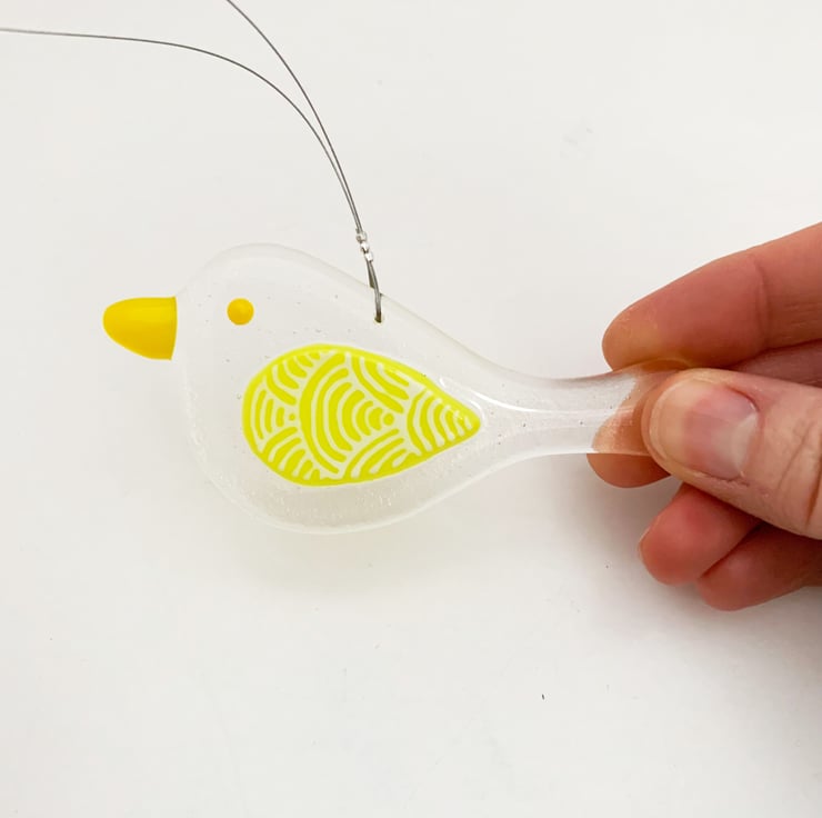 To make this bird, I have hand cut 2 bird shapes and fused them overnight in my kiln. The next day, I have added a beak and an eye and a yellow opaque wing which I've decorated with a white enamel handpainted pattern. The bird then goes back into the kiln again to tack fuse the eye, beak and wing onto the body. This time, the kiln is set on a lower temperature so the wing, eye and beak are slightly proud from the glass, giving it a 3D effect. Body is transparent glass, wing, eye and beak are opaque yellow glass.