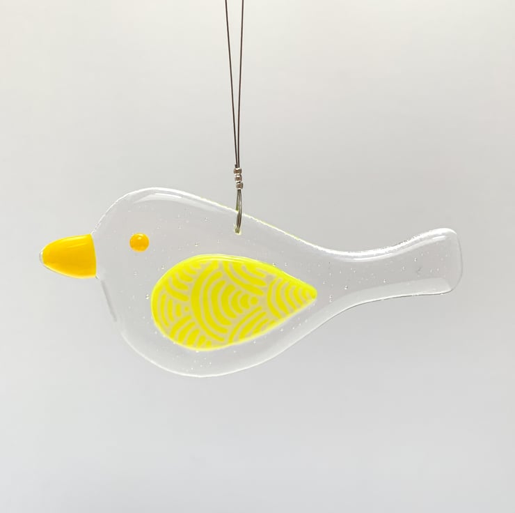 Fused glass hanging bird suncatcher. These birds have transparent bodies and a decorated opaque wing. They look lovely in a window and make a wonderful gift.