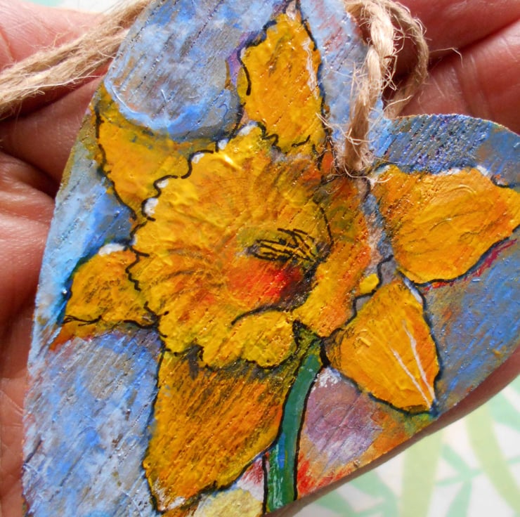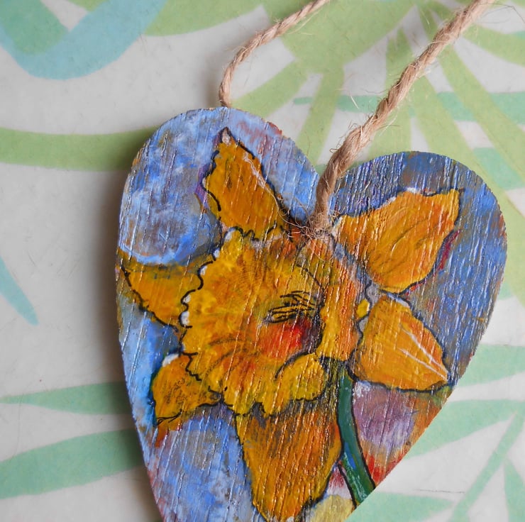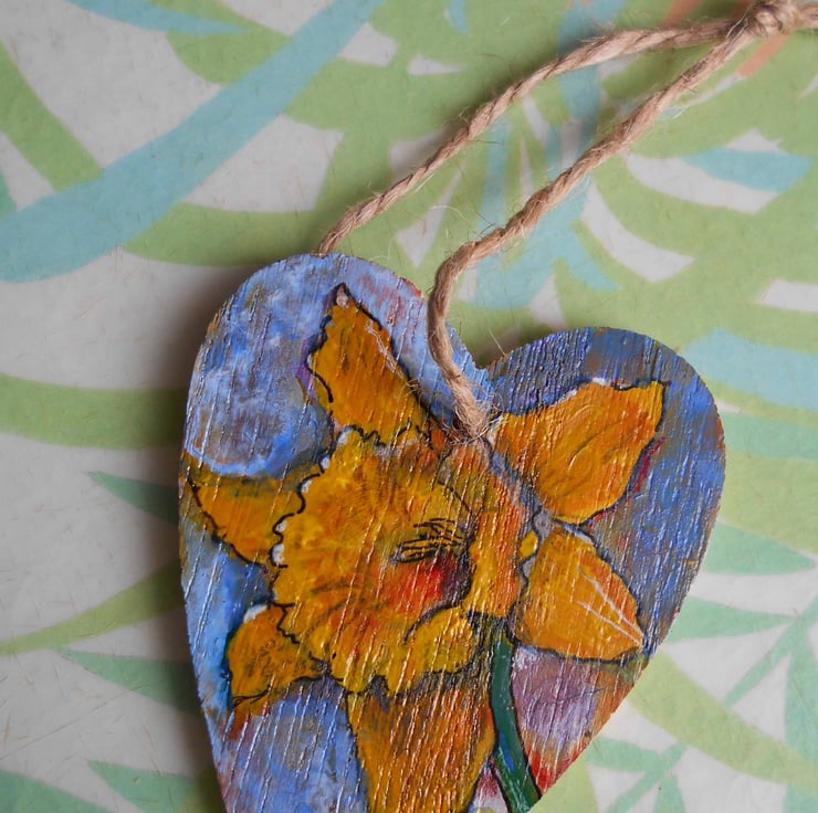This beautiful one of a kind hand painted daffodil wooden heart features a mixed media design. It has a rustic shabby chic style. Once dried, I varnished it on one side for added protection.