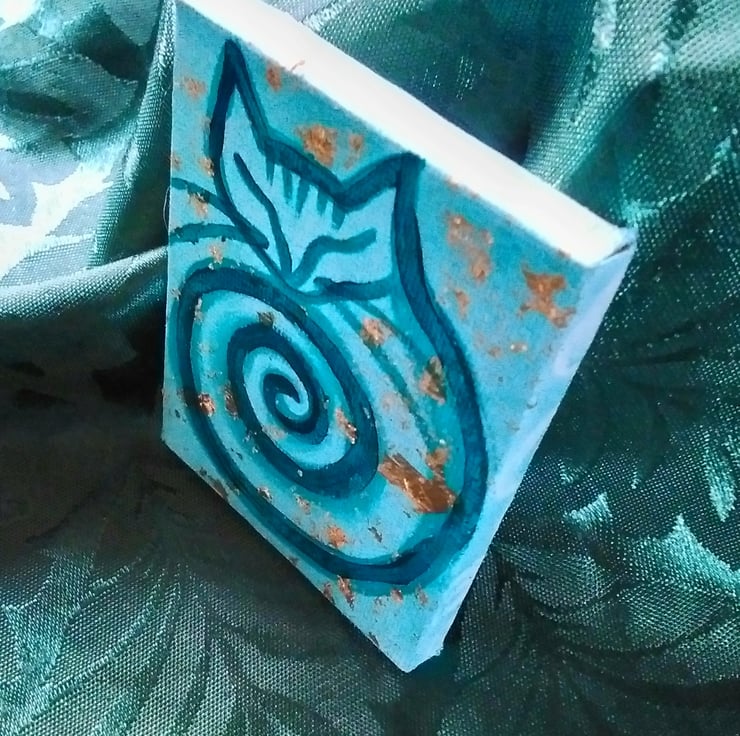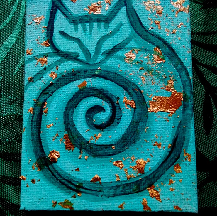 A unique piece of mini-art, painted in blue and gold acrylics, A cat, awake and alert, but with eyes firmly closed. And incorporated into the design is the spiral, one of the oldest symbols known to man. There's some ancient feline mysticism going on here, I'll warrant. Size: 7 c.m. x 9 c.m.