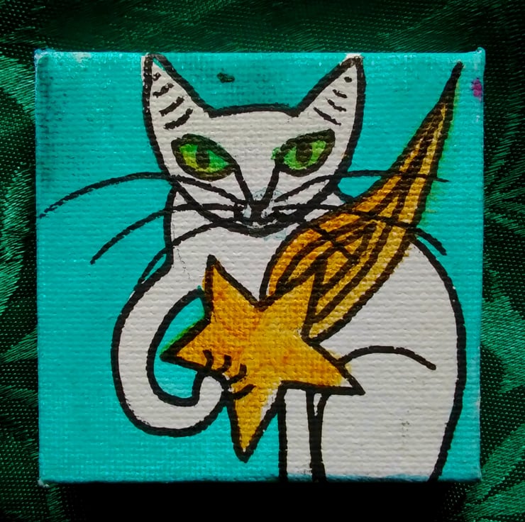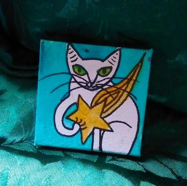 A unique piece of mini-art, this tiny acrylic painting of a cat clasping a flaming star has been rendered in a distinctly heraldic style. Symbols of good luck and wishes fulfilled, this is a perfect gift for cat lovers and astronomers everywhere. Size: 7 c.m. x 7 c.m.