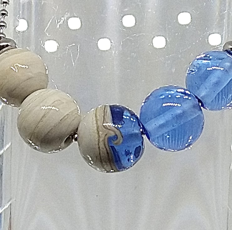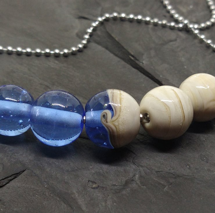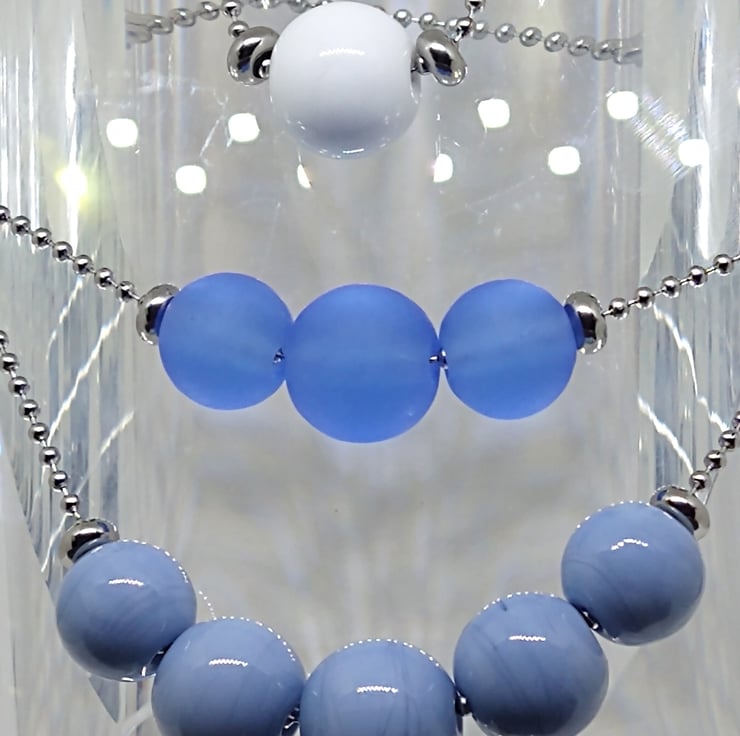 This necklace features a graduated set of glossy mid blue and ivory spherical beads, held in place with slider beads on a delicate 2mm stainless steel ball chain made to your perfect length. The beads measure between 12mm and 14mm across.