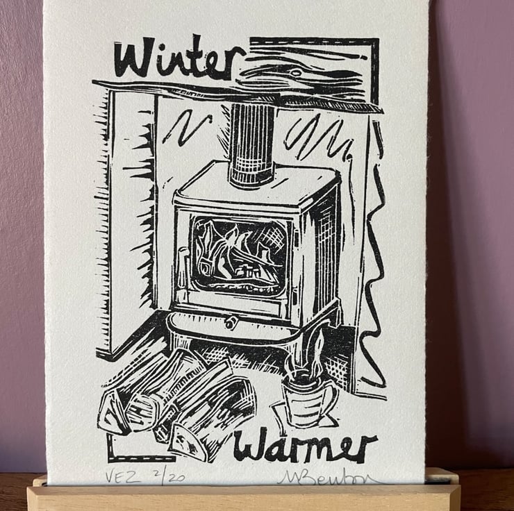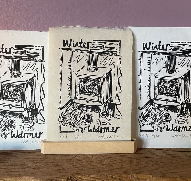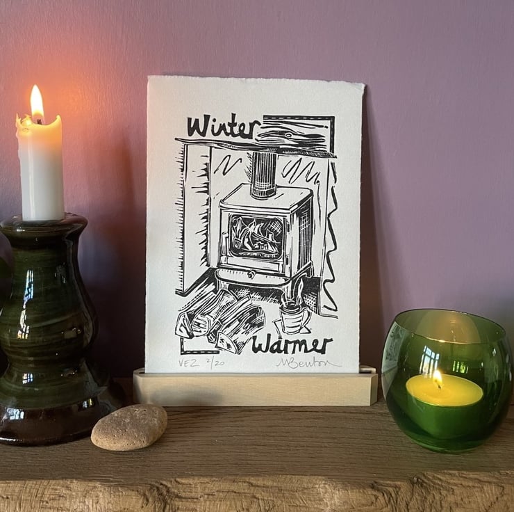 This little print was a lovely one to create. Inspired by cosy winter evenings by the fire, my ‘Winter Warmer’ depicts a log burner and hearth on a beautiful handmade Japanese paper.