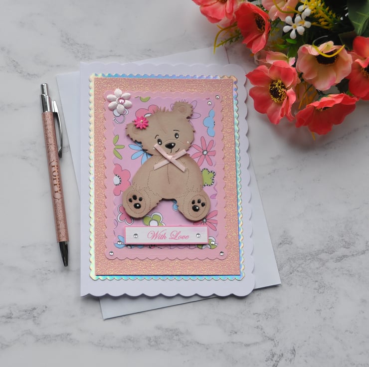 The 3D greeting tag says "With Love" and the card is finished with gems, a pink fabric flower, lots of glitter, and foiling.
