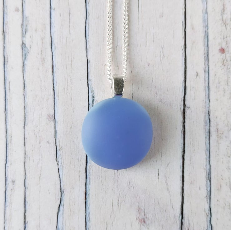 This pretty fused glass pendant has a satin finish just like seaglass. The frosted glass pendant is a soft lavender colour, somewhere between blue and purple, and has a beautiful glow. The pendant has a silver plated bail and comes complete with an 18" silver plated curb chain.