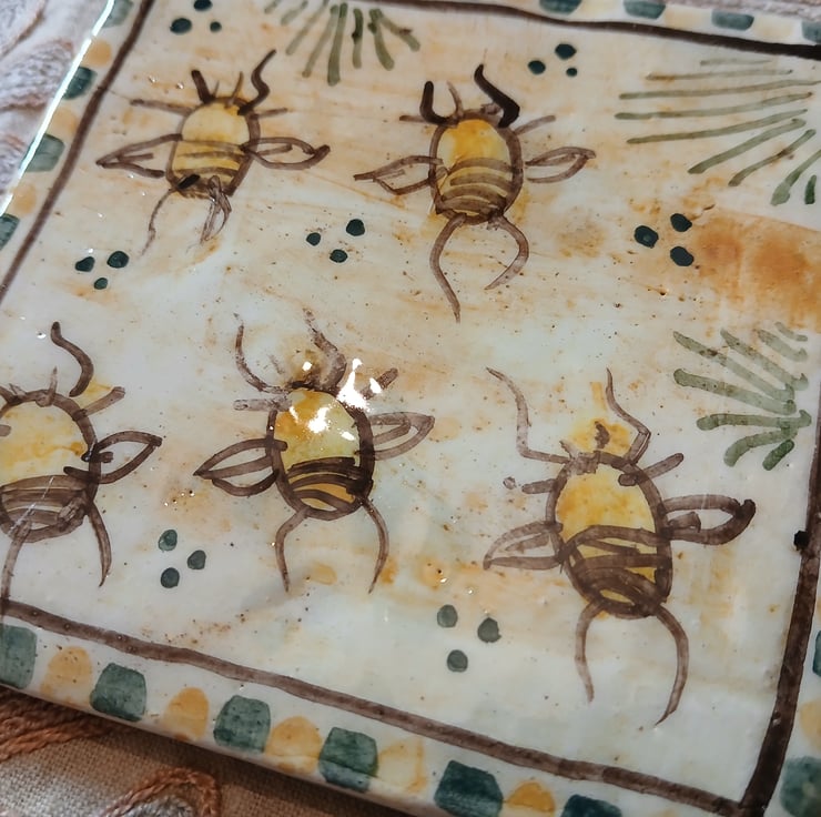 Hand made ceramic tile with medieval inspired bee design. Could be used as a tile or a coaster. 9.5cm square, 1 cm depth. Price includes postage and packing.