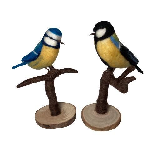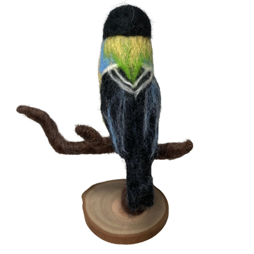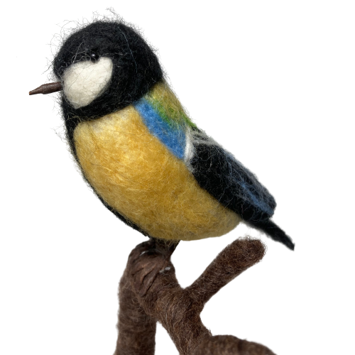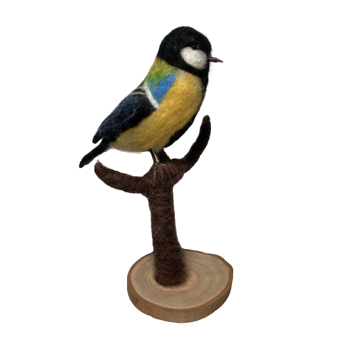 This model of a great tit has been needle felted from woollen fibres using a barbed felting needle. A core of white woollen fibres has been sculpted into shape and then a top coat of merino wool in appropriate colours added. The great tit has wired feet and beaded eyes. A perch has been created using brown wool needle felted over a wire armature and the great tit mounted on it. The whole ornament has then been mounted on a rustic wooden base.