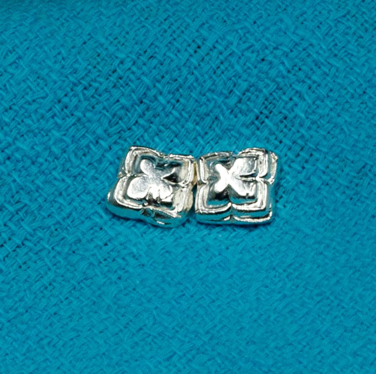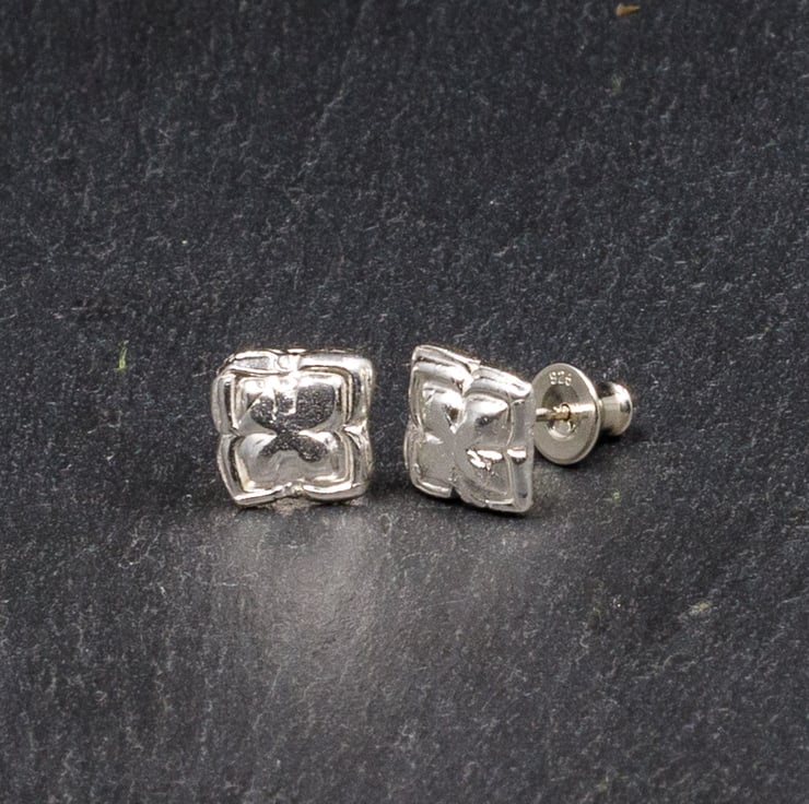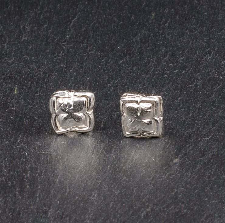 These stud earrings, made using silver clay, have a raised square patterned on them. They measure 9mm square approximately.